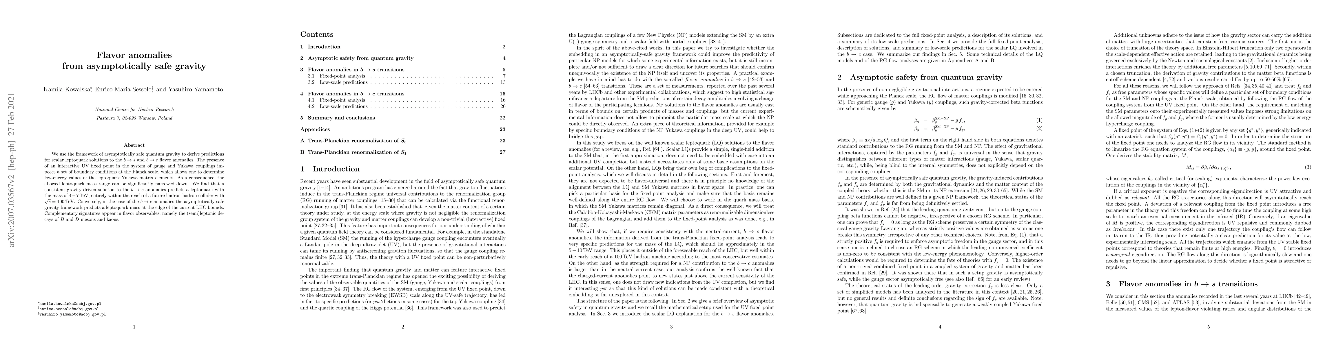 We use the framework of asymptotically safe quantum gravity to derive predictions for scalar leptoquark solutions to the $b \to s$ and $b\to c$ flavor anomalies. The presence of an interactive UV fixed point in the system of gauge and Yukawa couplings imposes a set of boundary conditions at the Planck scale, which allows one to determine low-energy values of the leptoquark Yukawa matrix elements. As a consequence, the allowed leptoquark mass range can be significantly narrowed down. We find that a consistent gravity-driven solution to the $b\to s$ anomalies predicts a leptoquark with the mass of 4-7 TeV, entirely within the reach of a future hadron-hadron collider with $\sqrt{s}=100$ TeV. Conversely, in the case of the $b\to c$ anomalies the asymptotically safe gravity framework predicts a leptoquark mass at the edge of the current LHC bounds. Complementary signatures appear in flavor observables, namely the (semi)leptonic decays of B and D mesons and kaons.