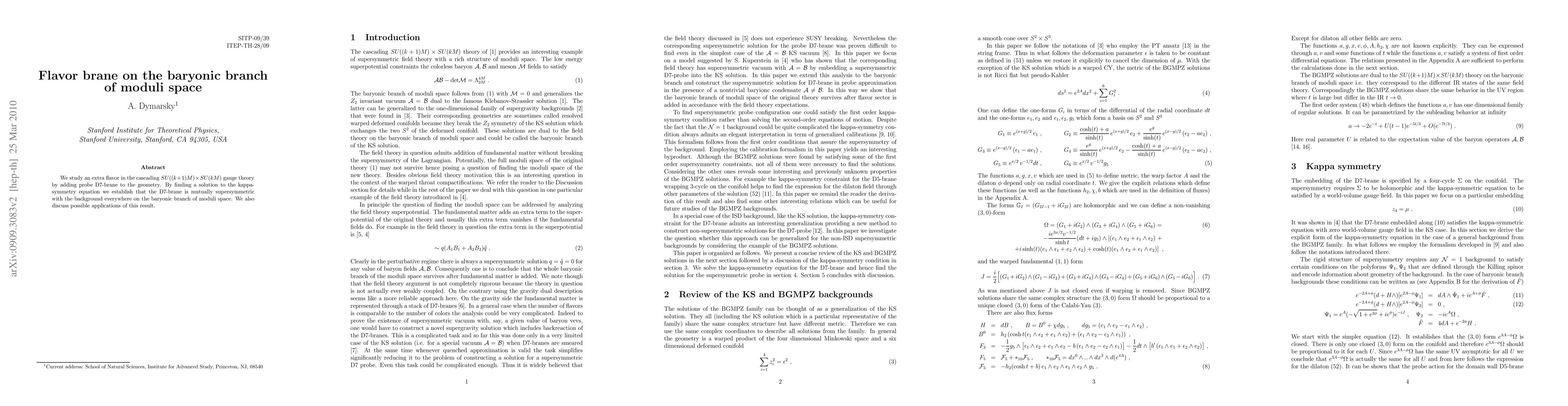 The research uses a probe D7-brane in the cascading SU((k+1)M)xSU(k M) gauge theory to study an extra flavor. It finds a solution to the kappa-symmetry equation, demonstrating mutual supersymmetry with the background on the baryonic branch of moduli space.
