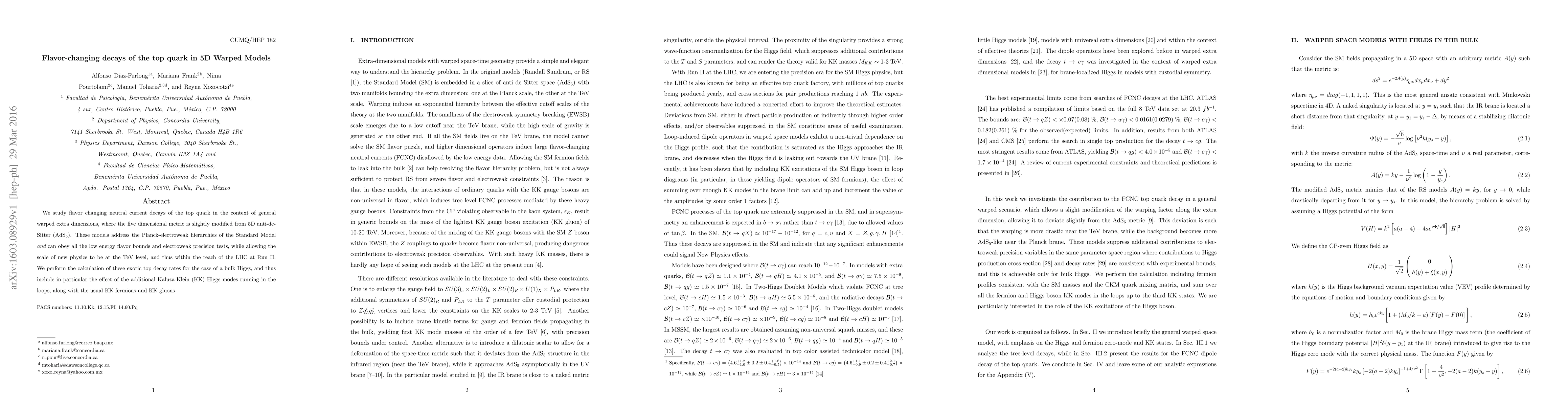 This paper investigates flavor-changing neutral current decays of the top quark in 5D warped models with modified AdS$_5$ geometry, allowing for new physics at the TeV level accessible by the LHC. It calculates exotic top decay rates considering the effects of additional Kaluza-Klein Higgs modes, alongside KK fermions and gluons.