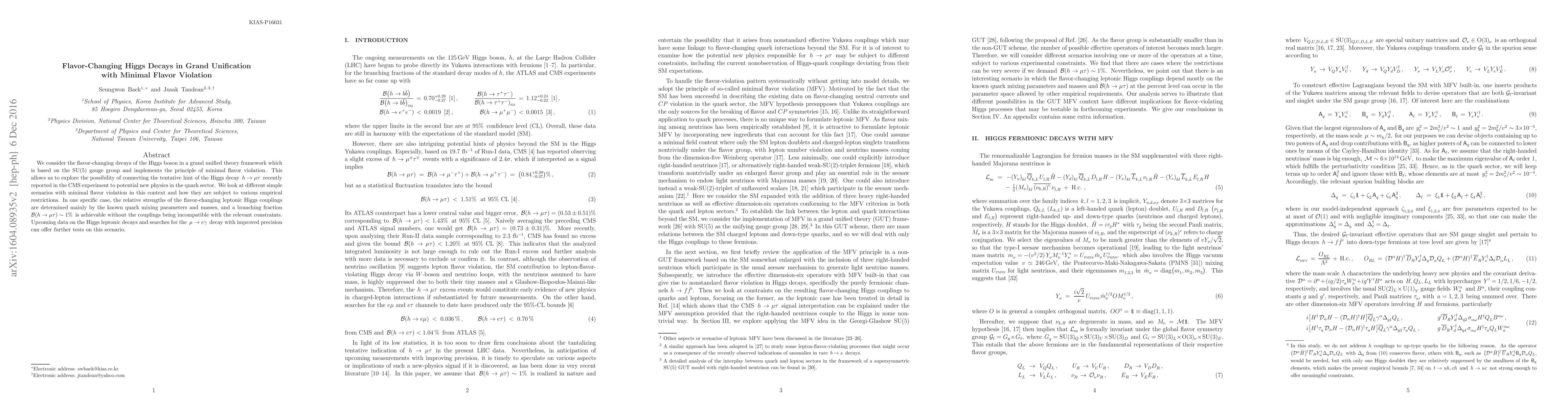 This paper explores flavor-changing Higgs decays in an SU(5) grand unified theory with minimal flavor violation, aiming to connect the CMS hint of $h\to\mu\tau$ to new physics. It finds that under certain scenarios, a branching fraction of ${\cal B}(h\to\mu\tau)\sim1\%$ is feasible, subject to empirical constraints, and suggests future data on Higgs and $\mu\to e\gamma$ decays for further validation.