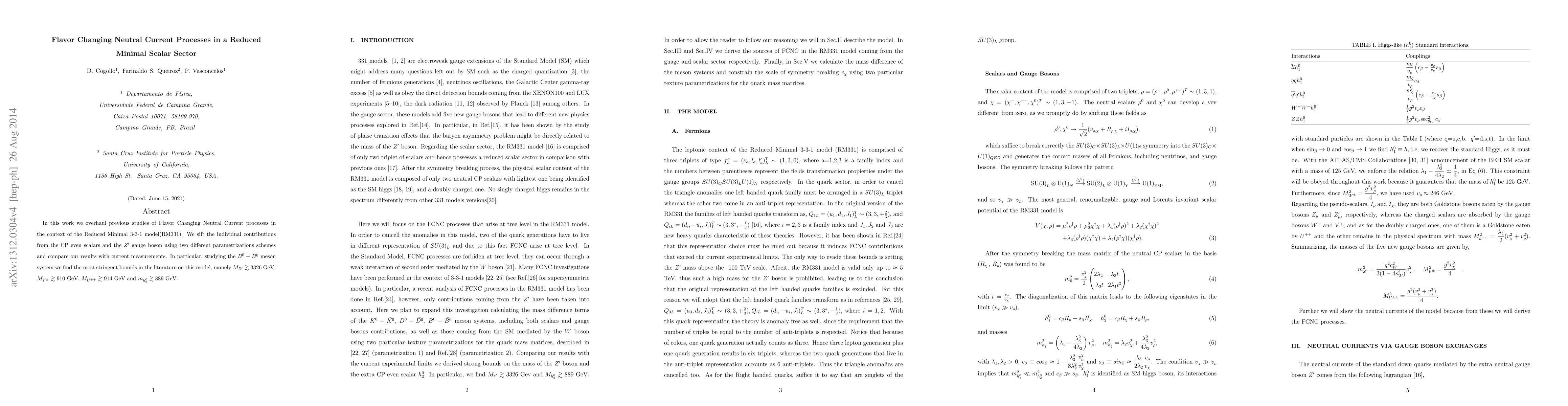In this work we overhaul previous studies of Flavor Changing Neutral Current processes in the context of the Reduced Minimal 3-3-1 model(RM331). We sift the individual contributions from the CP even scalars and the $Z^{\prime}$ gauge boson using two different parametrizations schemes and compare our results with current measurements. In particular, studying the $B^{0}-\bar{B^{0}}$ meson system we find the most stringent bounds in the literature on this model, namely $M_{Z^{\prime}} \gtrsim 3326$~GeV, $M_{V^{\pm}} \gtrsim 910$~GeV, $M_{U^{++}} \gtrsim 914$~GeV and $m_{h_2^0} \gtrsim 889$~GeV.