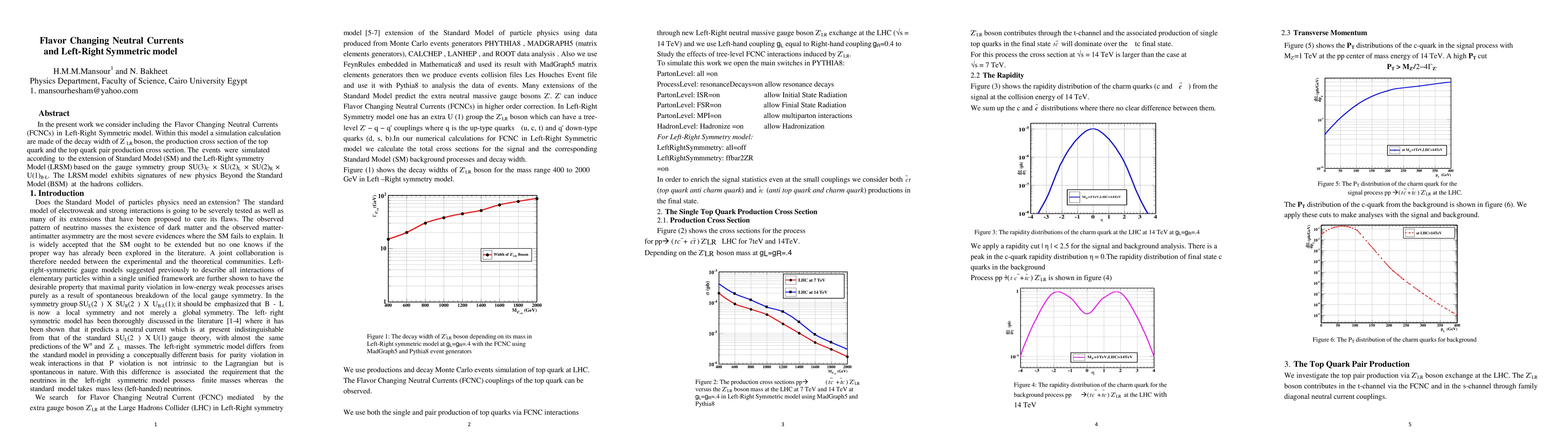 In the present work we consider including the Flavor Changing Neutral Currents (FCNCs) in Left-Right Symmetric model. Within this model a simulation calculation are made of the decay width of Z' LR boson, the production cross section of the top quark and the top quark pair production cross section. The events were simulated according to the extension of Standard Model (SM) and the Left-Right symmetry Model (LRSM) based on the gauge symmetry group SU(3)C SU(2)L SU(2)R U(1)B-L. The LRSM model exhibits signatures of new physics Beyond the Standard Model (BSM) at the hadrons colliders.