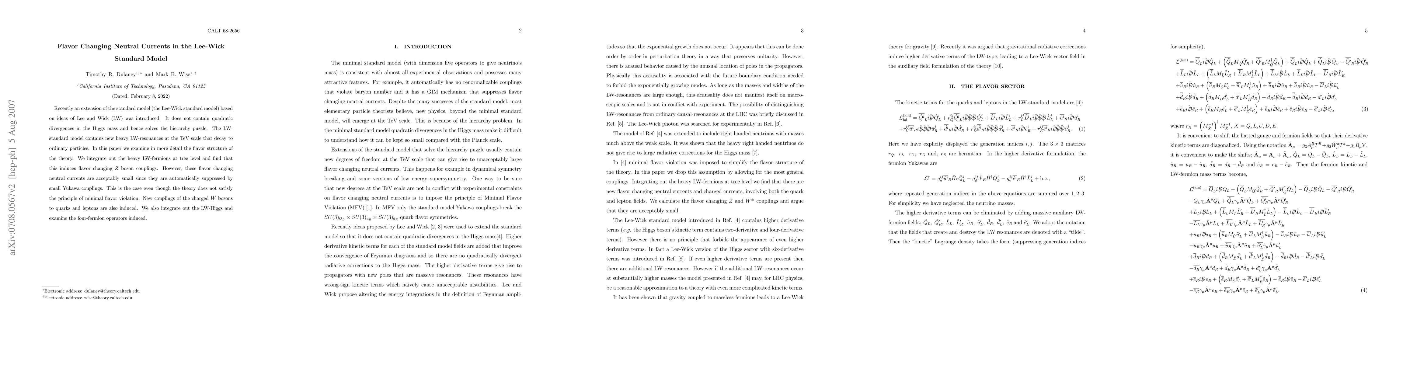 Recently an extension of the standard model (the Lee-Wick standard model) based on ideas of Lee and Wick (LW) was introduced. It does not contain quadratic divergences in the Higgs mass and hence solves the hierarchy puzzle. The LW-standard model contains new heavy LW-resonances at the TeV scale that decay to ordinary particles. In this paper we examine in more detail the flavor structure of the theory. We integrate out the heavy LW-fermions at tree level and find that this induces flavor changing Z boson couplings. However, these flavor changing neutral currents are acceptably small since they are automatically suppressed by small Yukawa couplings. This is the case even though the theory does not satisfy the principle of minimal flavor violation. New couplings of the charged W bosons to quarks and leptons are also induced. We also integrate out the LW-Higgs and examine the four-fermion operators induced.