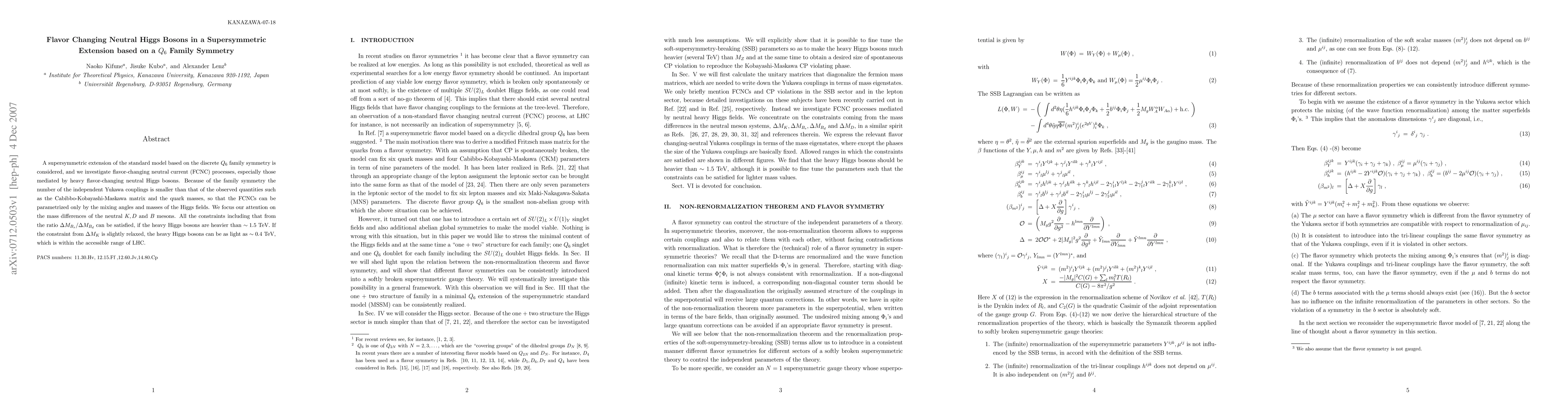 The paper introduces a supersymmetric model with a $Q_6$ family symmetry that reduces the number of independent Yukawa couplings, simplifying the analysis of FCNC processes mediated by heavy neutral Higgs bosons.