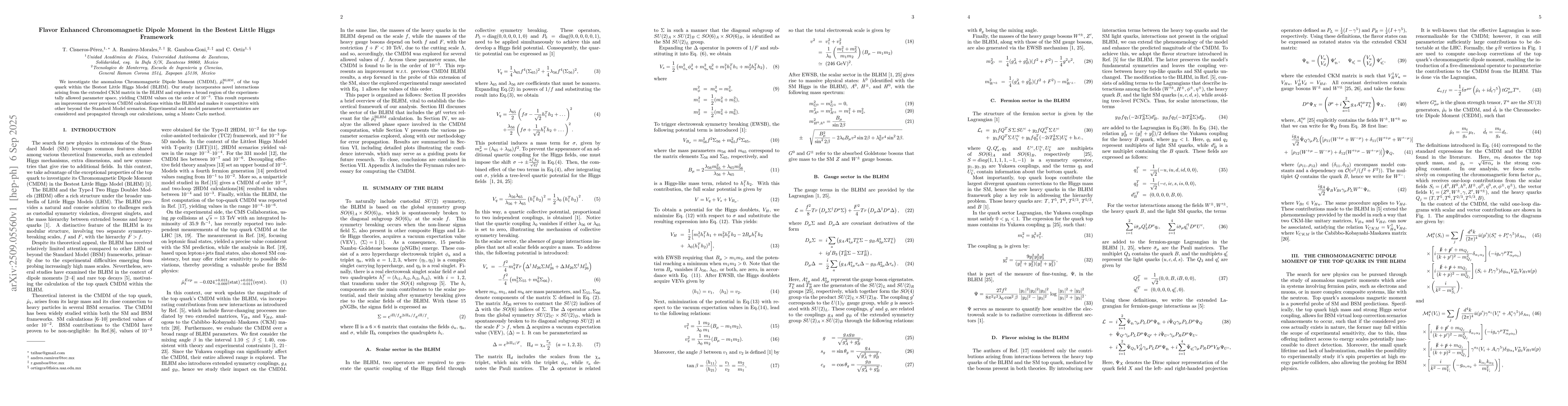 We investigate the anomalous Chromomagnetic Dipole Moment (CMDM), $\hat{\mu}_t^{\mathrm{BLHM}}$, of the top quark within the Bestest Little Higgs Model (BLHM). Our study incorporates novel interactions arising from the extended CKM matrix in the BLHM and explores a broad region of the experimentally allowed parameter space, yielding CMDM values on the order of $10^{-3}$. This result represents an improvement over previous CMDM calculations within the BLHM and makes it competitive with other beyond the Standard Model scenarios. Experimental and model parameter uncertainties are considered and propagated through our calculations, using a Monte Carlo method.