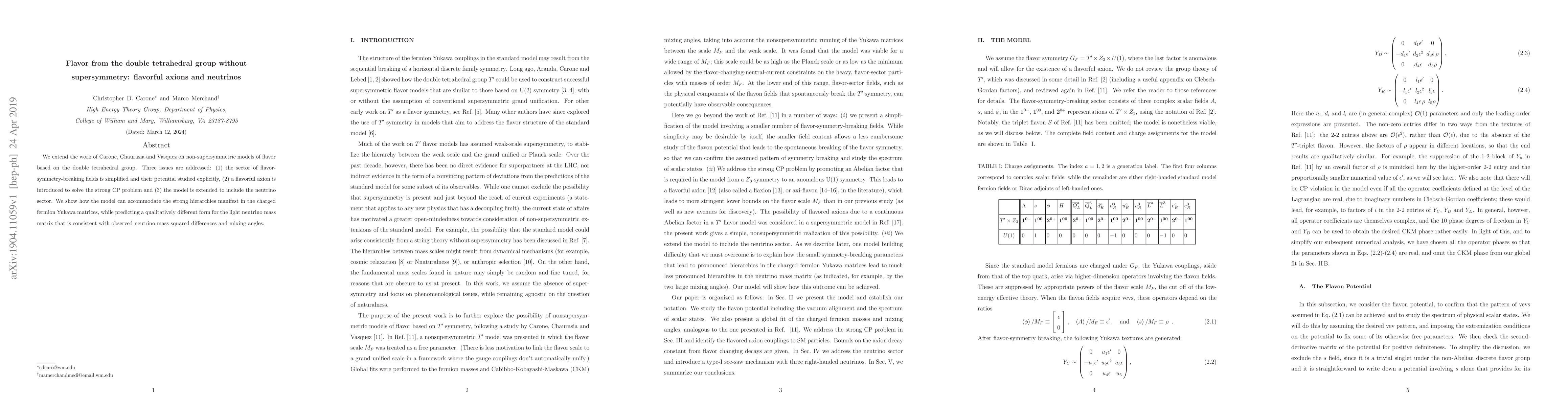 We extend the work of Carone, Chaurasia and Vasquez on non-supersymmetric models of flavor based on the double tetrahedral group. Three issues are addressed: (1) the sector of flavor-symmetry-breaking fields is simplified and their potential studied explicitly, (2) a flavorful axion is introduced to solve the strong CP problem and (3) the model is extended to include the neutrino sector. We show how the model can accommodate the strong hierarchies manifest in the charged fermion Yukawa matrices, while predicting a qualitatively different form for the light neutrino mass matrix that is consistent with observed neutrino mass squared differences and mixing angles.