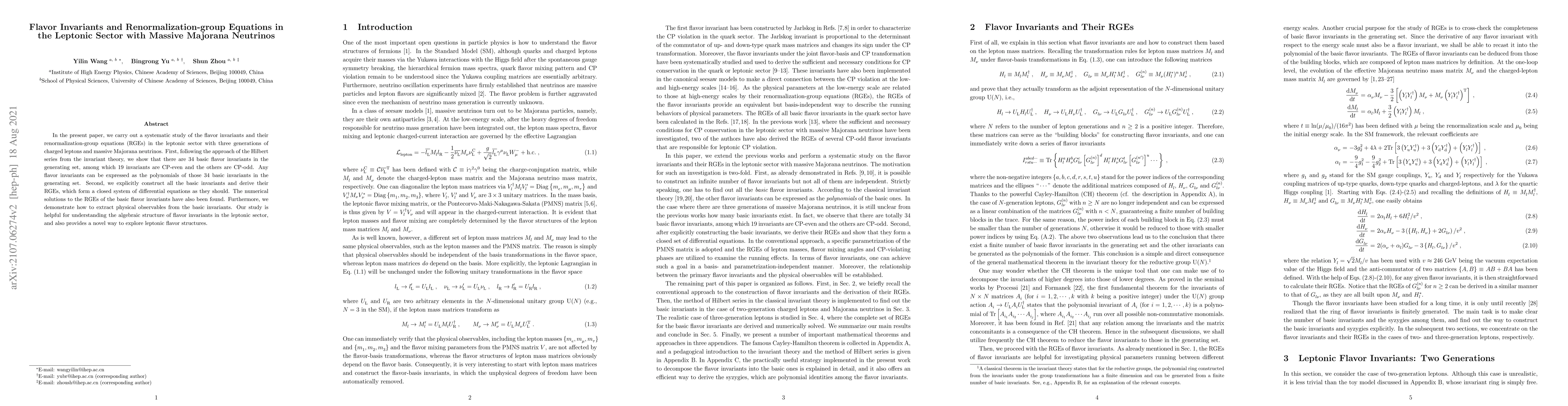 This paper systematically investigates the flavor invariants and their renormalization-group equations in the leptonic sector with three charged lepton generations and massive Majorana neutrinos. It identifies 34 basic flavor invariants, derives their RGEs, and provides a method to extract physical observables, contributing to the understanding of leptonic flavor structures.