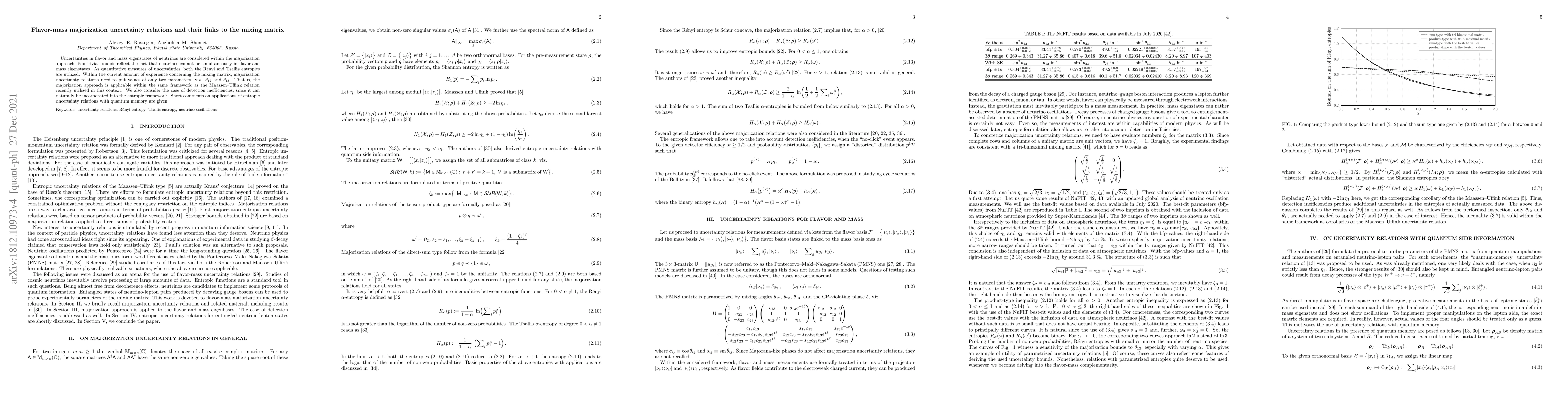 This paper explores uncertainty relations between flavor and mass eigenstates of neutrinos using majorization, with bounds derived from Rényi and Tsallis entropies. It links these relations to the mixing matrix, focusing on parameters $\theta_{12}$ and $\theta_{13}$, and discusses the implications of detection inefficiencies.