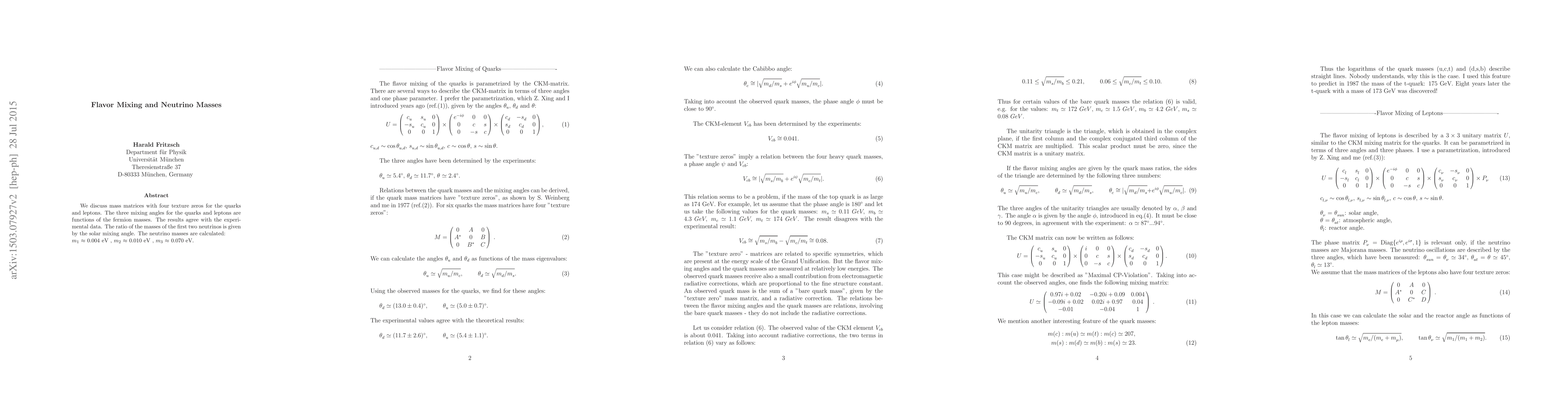 We discuss mass matrices with four texture zeros for the quarks and leptons. The three mixing angles for the quarks and leptons are functions of the fermion masses. The results agree with the experimental data. The ratio of the masses of the first two neutrinos is given by the solar mixing angle. The neutrino masses are calculated: $m_1$ $\approx$ 0.004 eV, $m_2$ $\approx$ 0.010 eV, $m_3$ $\approx$ 0.070 eV.