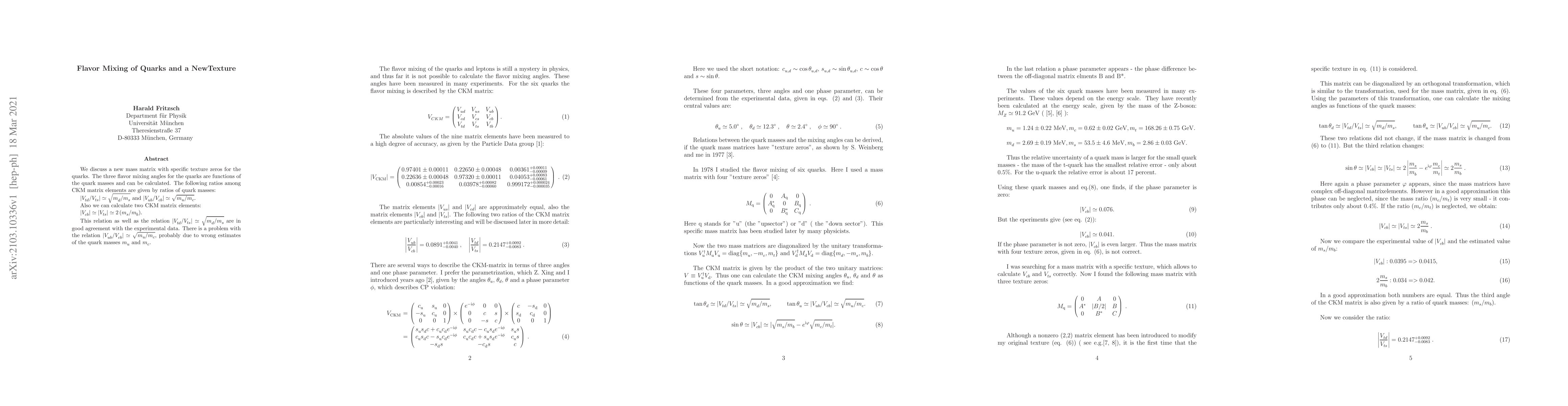 We discuss a new mass matrix with specific texture zeros for the quarks. The three flavor mixing angles for the quarks are functions of the quark masses and can be calculated. The following ratios among CKM matrix elements are given by ratios of quark masses: |Vtd/Vts| ' q md /ms and |Vub/Vcb| ' p mu/mc . Also we can calculate two CKM matrix elements: |Vcb| ' |Vts| ' 2 (ms/mb ). This relation as well as the relation |Vtd/Vts| ' q md /ms are in good agreement with the experimental data. There is a problem with the relation |Vub/Vcb| ' p mu/mc , probably due to wrong estimates of the quark masses mu and m