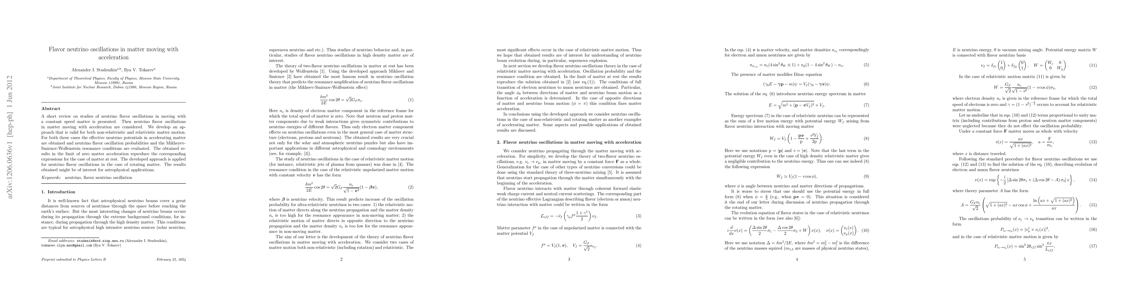 This paper reviews neutrino flavor oscillations in constant-speed matter and extends the analysis to accelerating matter, developing a method valid for both non-relativistic and relativistic scenarios. The study evaluates effective neutrino potentials and oscillation probabilities, including the Mikheyev-Smirnov-Wolfenstein resonance, and applies the approach to rotating matter, with potential implications for astrophysical phenomena.