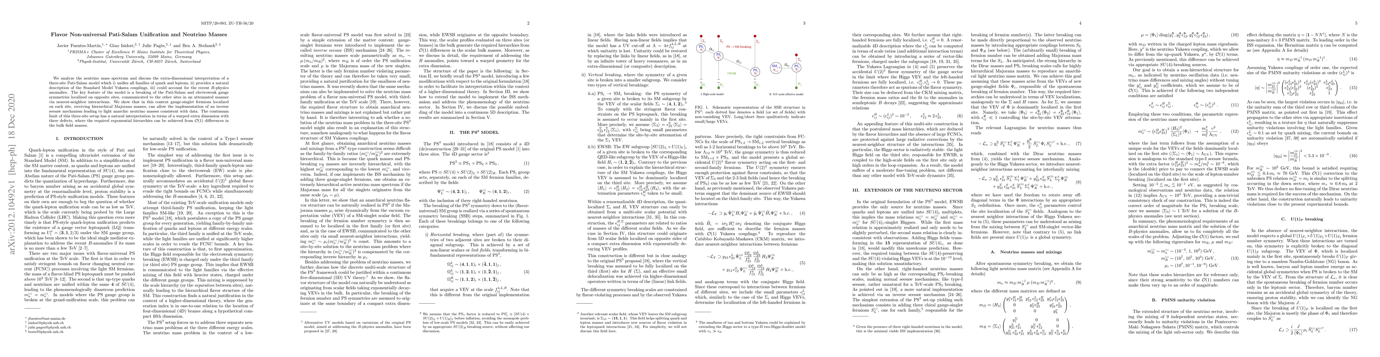 We analyze the neutrino mass spectrum and discuss the extra-dimensional interpretation of a three-site Pati-Salam model which i) unifies all families of quark and leptons, ii) provides a natural description of the Standard Model Yukawa couplings, iii) could account for the recent $B$-physics anomalies. The key feature of the model is a breaking of the Pati-Salam and electroweak gauge symmetries localized on opposite sites, communicated to the other sites in an attenuated manner via nearest-neighbor interactions. We show that in this context gauge-singlet fermions localized on each site, receiving hierarchical Majorana masses, can allow the implementation of an inverse seesaw mechanism leading to light anarchic neutrino masses consistent with data. The continuum limit of this three-site setup has a natural interpretation in terms of a warped extra dimension with three defects, where the required exponential hierarchies can be achieved from $\mathcal{O}(1)$ differences in the bulk field masses.