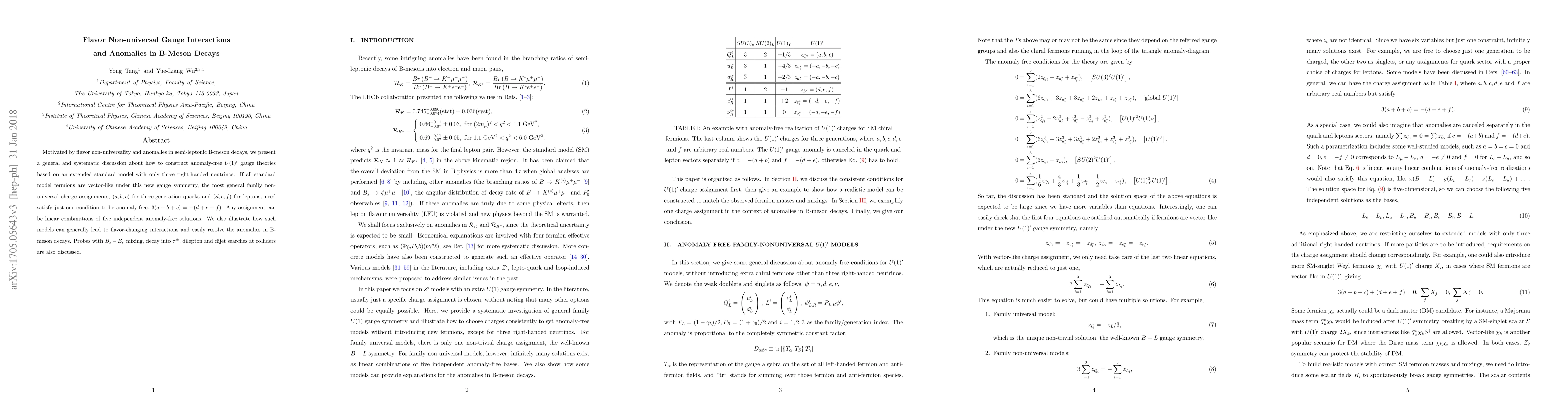 This paper explores the construction of anomaly-free $U(1)'$ gauge theories within an extended standard model featuring three right-handed neutrinos, addressing flavor non-universality and anomalies in B-meson decays. The study identifies a single condition for family non-universal charge assignments to be anomaly-free and discusses how these models can resolve B-meson decay anomalies.