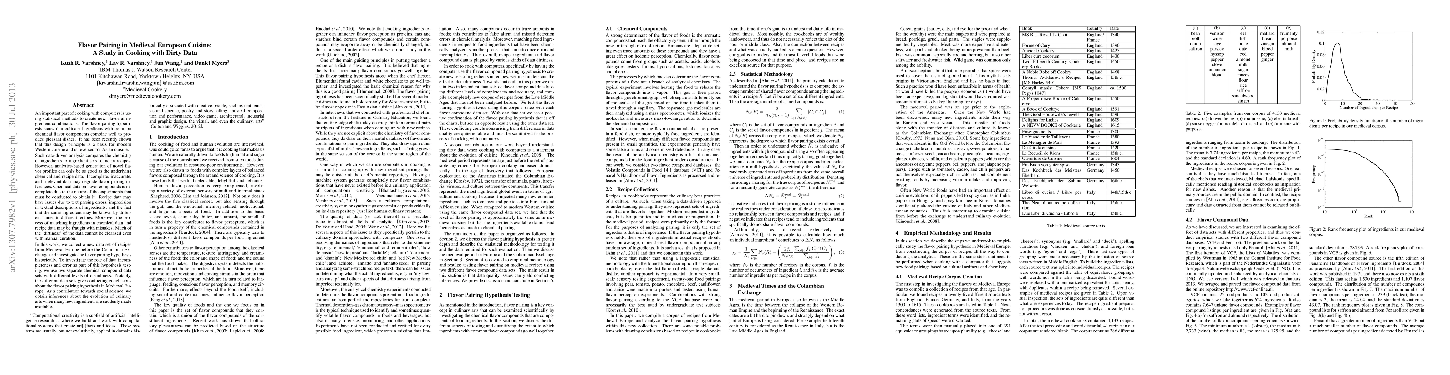 An important part of cooking with computers is using statistical methods to create new, flavorful ingredient combinations. The flavor pairing hypothesis states that culinary ingredients with common chemical flavor components combine well to produce pleasant dishes. It has been recently shown that this design principle is a basis for modern Western cuisine and is reversed for Asian cuisine. Such data-driven analysis compares the chemistry of ingredients to ingredient sets found in recipes. However, analytics-based generation of novel flavor profiles can only be as good as the underlying chemical and recipe data. Incomplete, inaccurate, and irrelevant data may degrade flavor pairing inferences. Chemical data on flavor compounds is incomplete due to the nature of the experiments that must be conducted to obtain it. Recipe data may have issues due to text parsing errors, imprecision in textual descriptions of ingredients, and the fact that the same ingredient may be known by different names in different recipes. Moreover, the process of matching ingredients in chemical data and recipe data may be fraught with mistakes. Much of the `dirtiness' of the data cannot be cleansed even with manual curation. In this work, we collect a new data set of recipes from Medieval Europe before the Columbian Exchange and investigate the flavor pairing hypothesis historically. To investigate the role of data incompleteness and error as part of this hypothesis testing, we use two separate chemical compound data sets with different levels of cleanliness. Notably, the different data sets give conflicting conclusions about the flavor pairing hypothesis in Medieval Europe. As a contribution towards social science, we obtain inferences about the evolution of culinary arts when many new ingredients are suddenly made available.