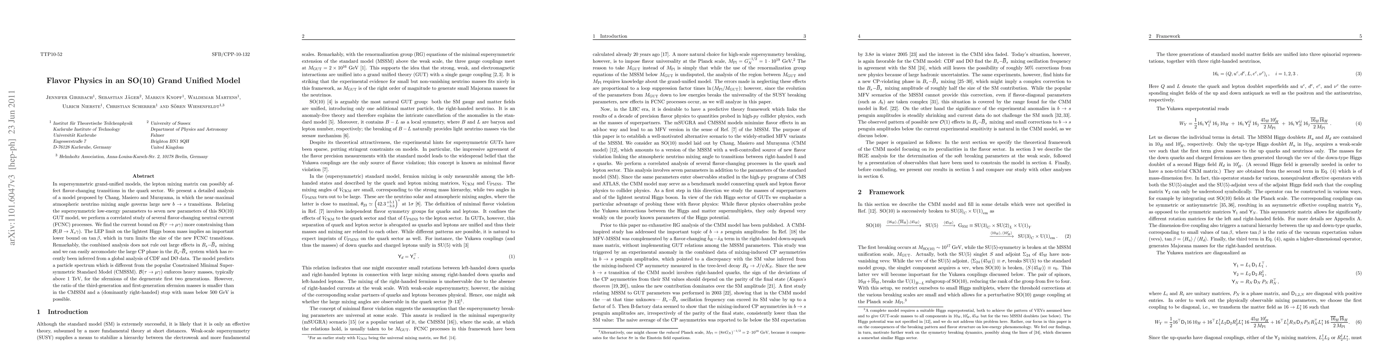 The research employs a detailed analysis of the Chang-Masiero-Murayama (CMM) model within an SO(10) grand unified theory (GUT), examining flavor-changing neutral current (FCNC) processes and correlating supersymmetric low-energy parameters with new parameters of the model.
