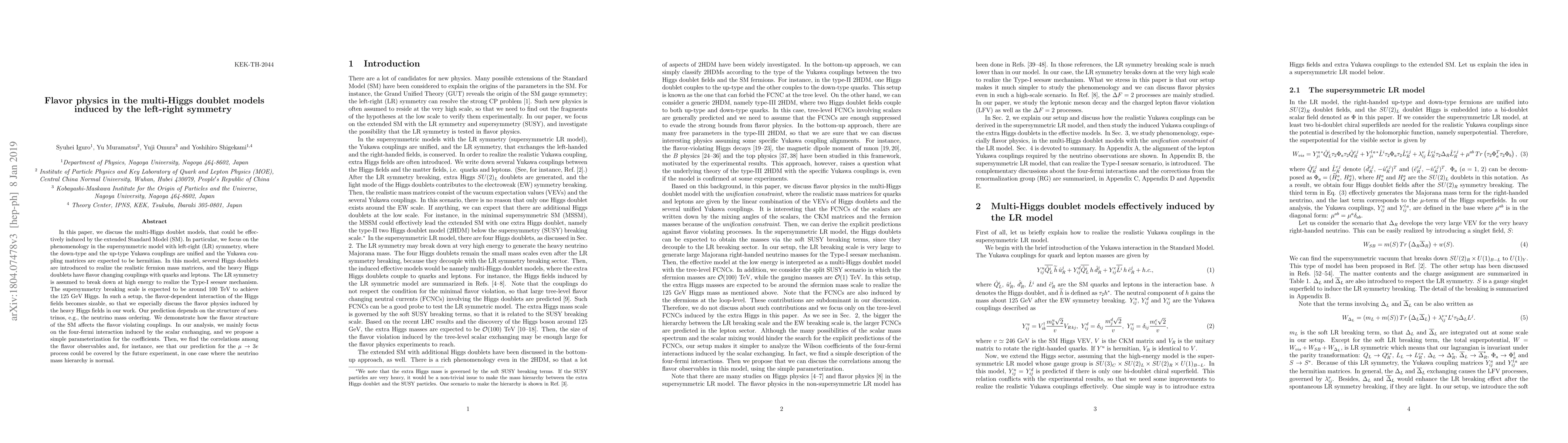 In this paper, we discuss the multi-Higgs doublet models, that could be effectively induced by the extended Standard Model (SM). In particular, we focus on the phenomenology in the supersymmetric model with left-right (LR) symmetry, where the down-type and the up-type Yukawa couplings are unified and the Yukawa coupling matrices are expected to be hermitian. In this model, several Higgs doublets are introduced to realize the realistic fermion mass matrices, and the heavy Higgs doublets have flavor changing couplings with quarks and leptons. The LR symmetry is assumed to break down at high energy to realize the Type-I seesaw mechanism. The supersymmetry breaking scale is expected to be around 100 TeV to achieve the 125 GeV Higgs. In such a setup, the flavor-dependent interaction of the Higgs fields becomes sizable, so that we especially discuss the flavor physics induced by the heavy Higgs fields in our work. Our prediction depends on the structure of neutrinos, e.g., the neutrino mass ordering. We demonstrate how the flavor structure of the SM affects the flavor violating couplings. In our analysis, we mainly focus on the four-fermi interaction induced by the scalar exchanging, and we propose a simple parameterization for the coefficients. Then, we find the correlations among the flavor observables and, for instance, see that our prediction for the $\mu \to 3 e$ process could be covered by the future experiment, in one case where the neutrino mass hierarchy is normal.