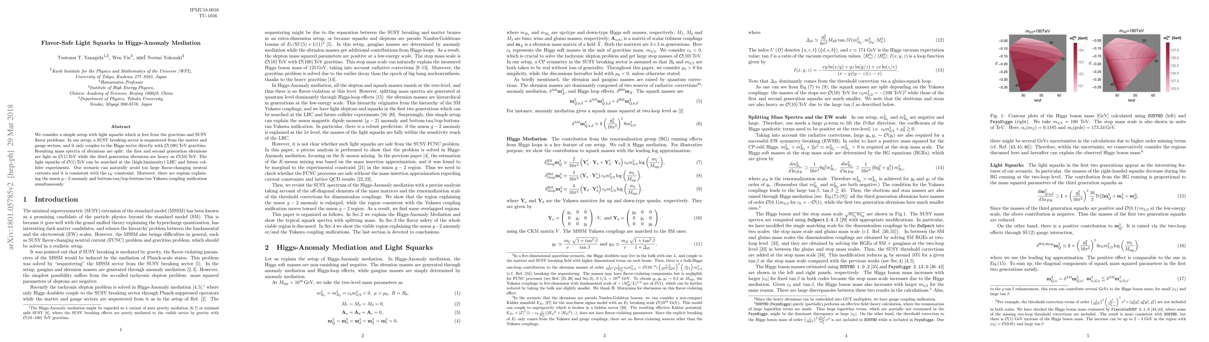 We consider a simple setup with light squarks which is free from the gravitino and SUSY flavor problems. In our setup, a SUSY breaking sector is sequestered from the matter and gauge sectors, and it only couples to the Higgs sector directly with $\mathcal{O}(100)\,$TeV gravitino. Resulting mass spectra of sfermions are split: the first and second generation sfermions are light as $\mathcal{O}(1)\,$TeV while the third generation sfermions are heavy as $\mathcal{O}(10)\,$TeV. The light squarks of $\mathcal{O}(1)\,$TeV can be searched at the (high-luminosity) LHC and future collider experiments. Our scenario can naturally avoid too large flavor-changing neutral currents and it is consistent with the $\epsilon_K$ constraint. Moreover, there are regions explaining the muon $g-2$ anomaly and bottom-tau/top-bottom-tau Yukawa coupling unification simultaneously.
