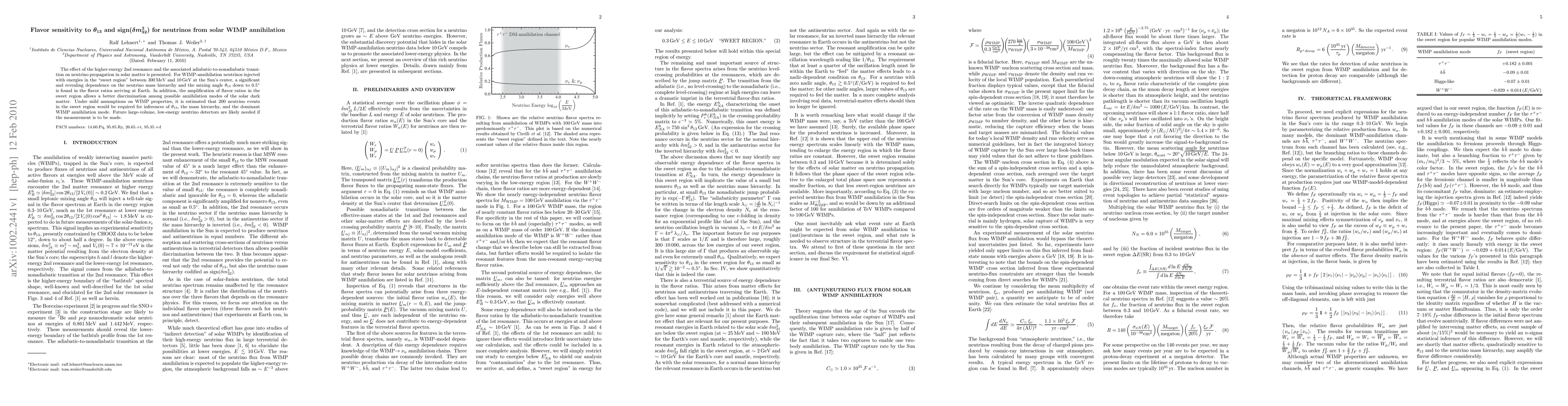 This paper investigates how neutrino propagation in solar matter is influenced by the second resonance and the transition between adiabatic and nonadiabatic regimes, revealing significant sensitivity to the mixing angle theta_13 and the neutrino mass hierarchy. It suggests that detecting 200 WIMP-annihilation neutrinos in the "sweet region" could discern these parameters, necessitating future large-volume, low-energy neutrino detectors.