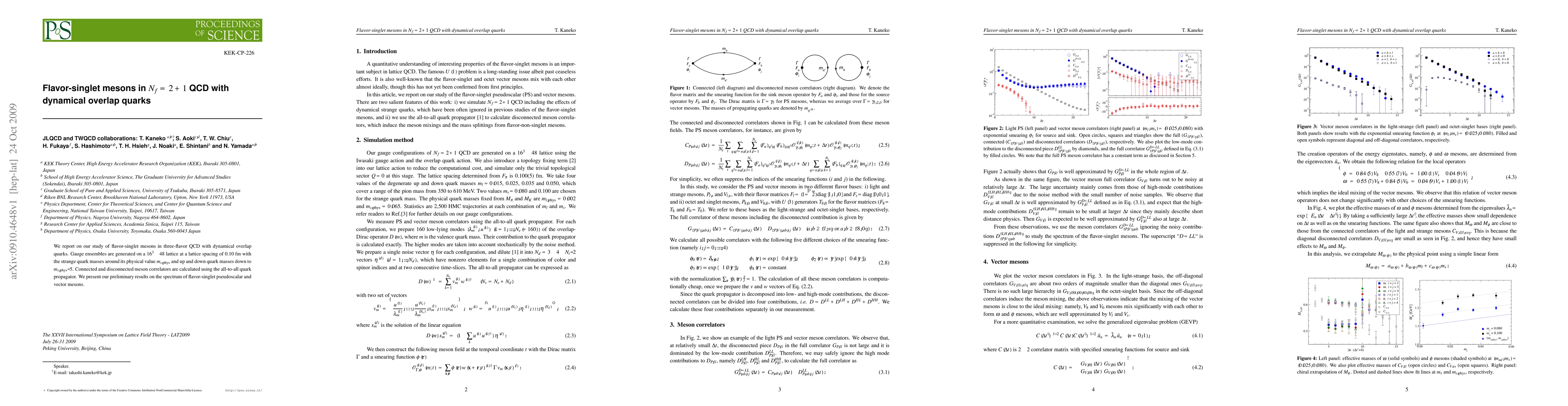 This study investigates flavor-singlet mesons in three-flavor QCD with dynamical overlap quarks, generating gauge ensembles on a 16^3 x 48 lattice. Preliminary results on the spectrum of flavor-singlet pseudoscalar and vector mesons are presented.