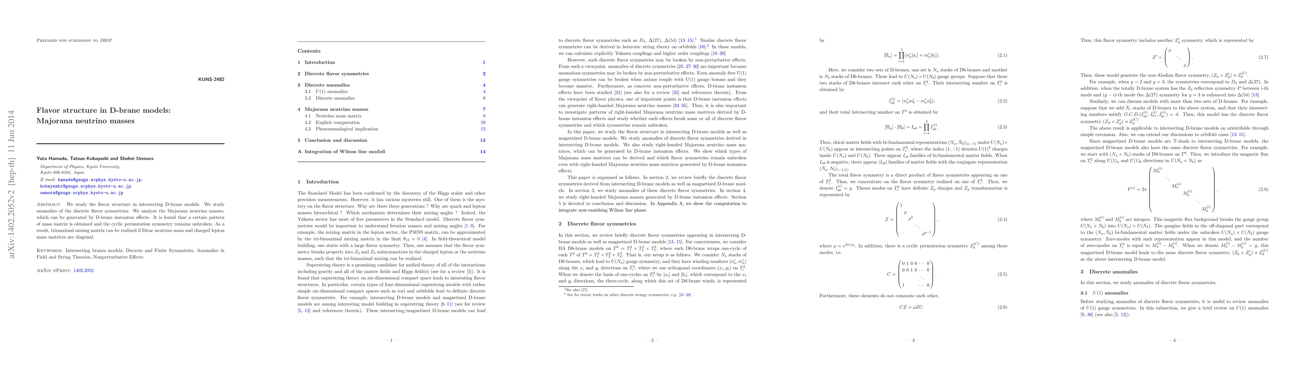 We study the flavor structure in intersecting D-brane models. We study anomalies of the discrete flavor symmetries. We analyze the Majorana neutrino masses, which can be generated by D-brane instanton effects. It is found that a certain pattern of mass matrix is obtained and the cyclic permutation symmetry remains unbroken. As a result, trimaximal mixing matrix can be realized if Dirac neutrino mass and charged lepton mass matrices are diagonal.