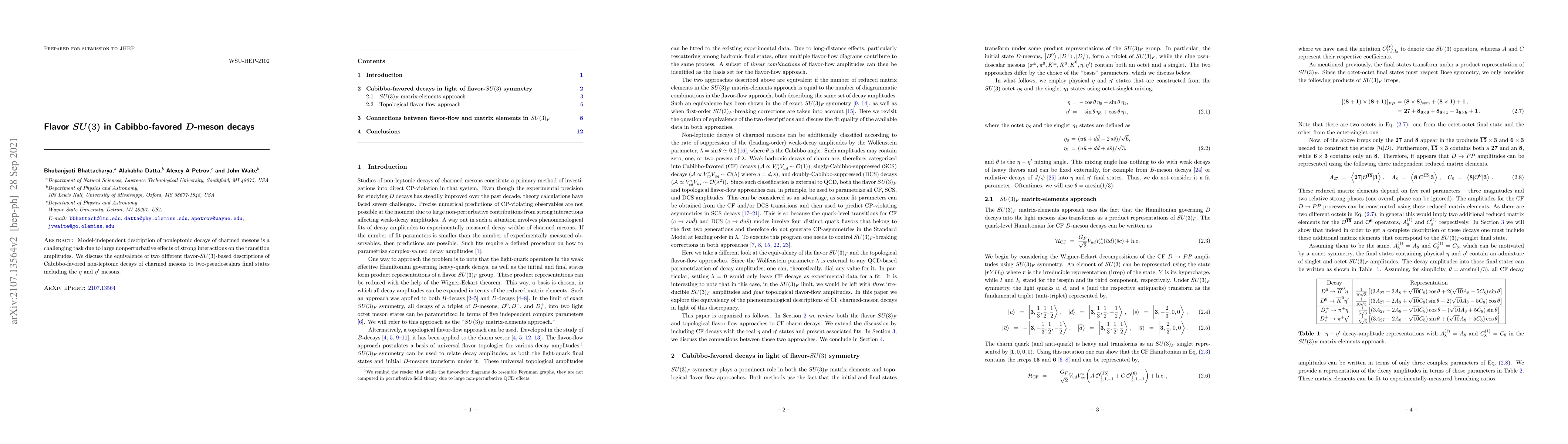 Model-independent description of nonleptonic decays of charmed mesons is a challenging task due to large nonperturbative effects of strong interactions on the transition amplitudes. We discuss the equivalence of two different flavor-$SU(3)$-based descriptions of Cabibbo-favored non-leptonic decays of charmed mesons to two-pseudoscalars final states including the $\eta$ and $\eta^\prime$ mesons.