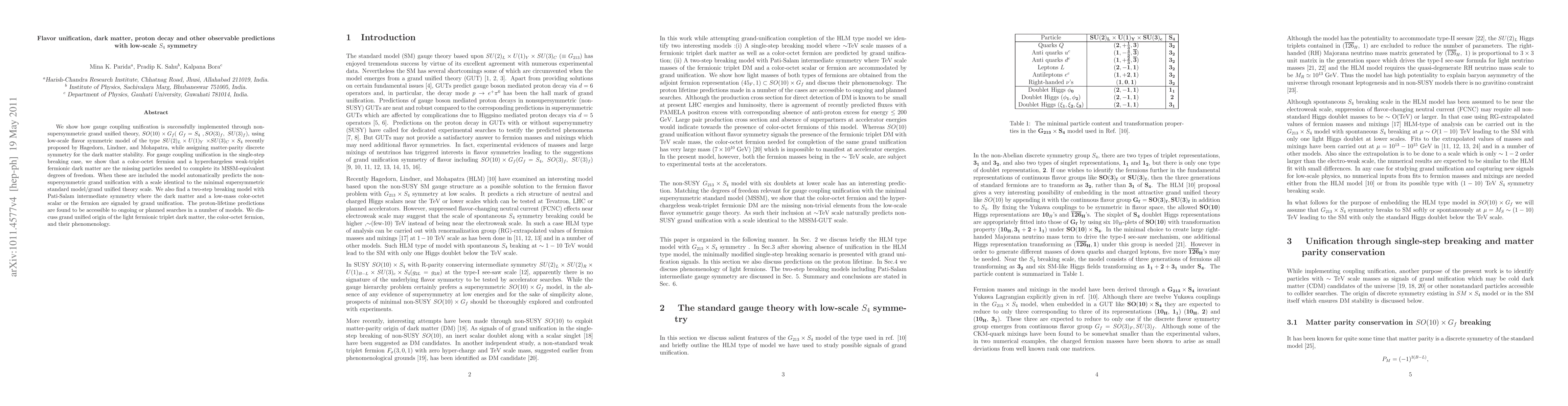 We show how gauge coupling unification is successfully implemented through non-supersymmetric grand unified theory, $SO(10)\times G_f (~G_f=S_4, SO(3)_f, SU(3)_f)$, using low-scale flavor symmetric model of the type $SU(2)_L\times U(1)_Y$ $ \times SU(3)_C \times S_4$ recently proposed by Hagedorn, Lindner, and Mohapatra, while assigning matter-parity discrete symmetry for the dark matter stability. For gauge coupling unification in the single-step breaking case, we show that a color-octet fermion and a hyperchargeless weak-triplet fermionic dark matter are the missing particles needed to complete its MSSM-equivalent degrees of freedom. When these are included the model automatically predicts the nonsupersymmetric grand unification with a scale identical to the minimal supersymmetric standard model/grand unified theory scale. We also find a two-step breaking model with Pati-Salam intermediate symmetry where the dark matter and a low-mass color-octet scalar or the fermion are signaled by grand unification. The proton-lifetime predictions are found to be accessible to ongoing or planned searches in a number of models. We discuss grand unified origin of the light fermionic triplet dark matter, the color-octet fermion, and their phenomenology.