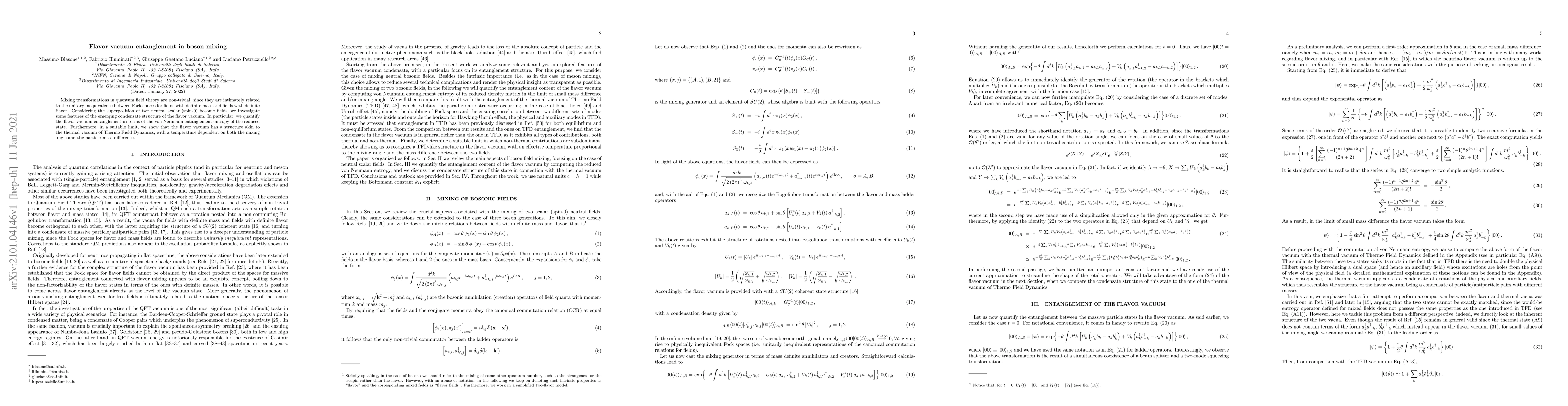 Mixing transformations in quantum field theory are non-trivial, since they are intimately related to the unitary inequivalence between Fock spaces for fields with definite mass and fields with definite flavor. Considering the superposition of two neutral scalar (spin-0) bosonic fields, we investigate some features of the emerging condensate structure of the flavor vacuum. In particular, we quantify the flavor vacuum entanglement in terms of the von Neumann entanglement entropy of the reduced state. Furthermore, in a suitable limit, we show that the flavor vacuum has a structure akin to the thermal vacuum of Thermo Field Dynamics, with a temperature dependent on both the mixing angle and the particle mass difference.