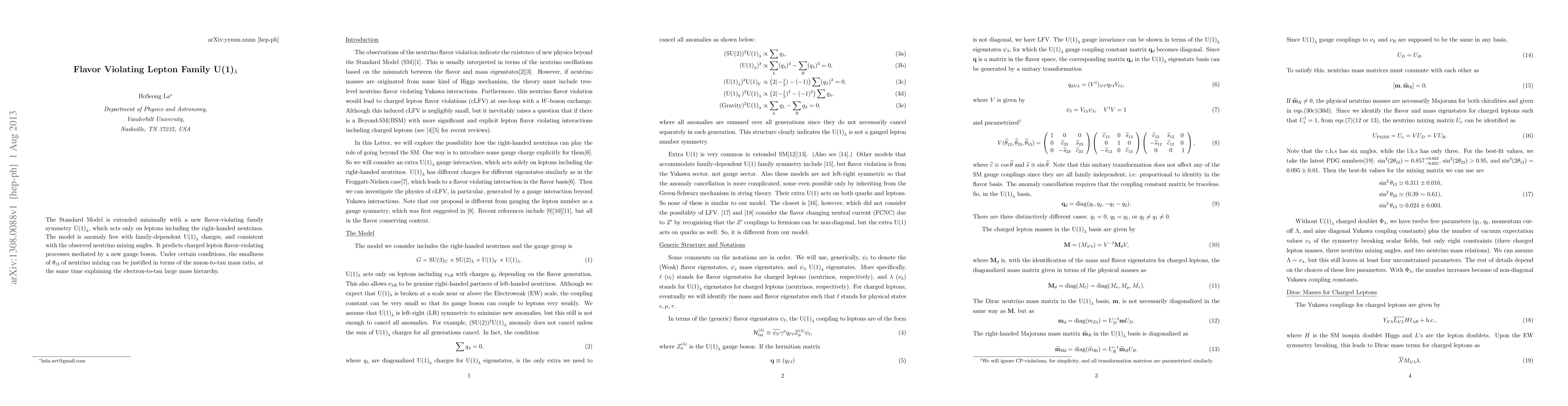 This paper extends the Standard Model with a new flavor-violating ${\rm U(1)}_\lambda$ symmetry for leptons, including right-handed neutrinos, predicting charged lepton flavor-violating processes via a new gauge boson, while justifying the smallness of $\theta_{13}$ and explaining the electron-to-tau mass hierarchy.