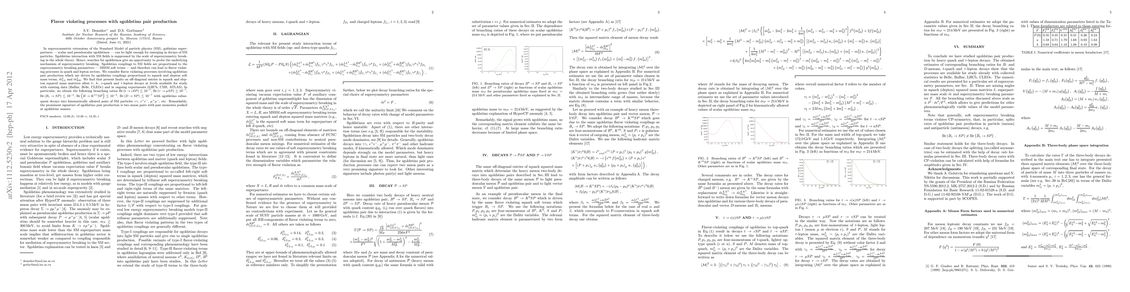 This paper investigates flavor-violating processes in supersymmetric extensions of the Standard Model, focusing on sgoldstino pair production. It finds that current experimental limits allow for the study of several quark and lepton decays involving sgoldstinos, with branching ratios on the order of 10^-7 to 10^-4, and highlights the potential signature of two muon pairs with specific momentum distributions.