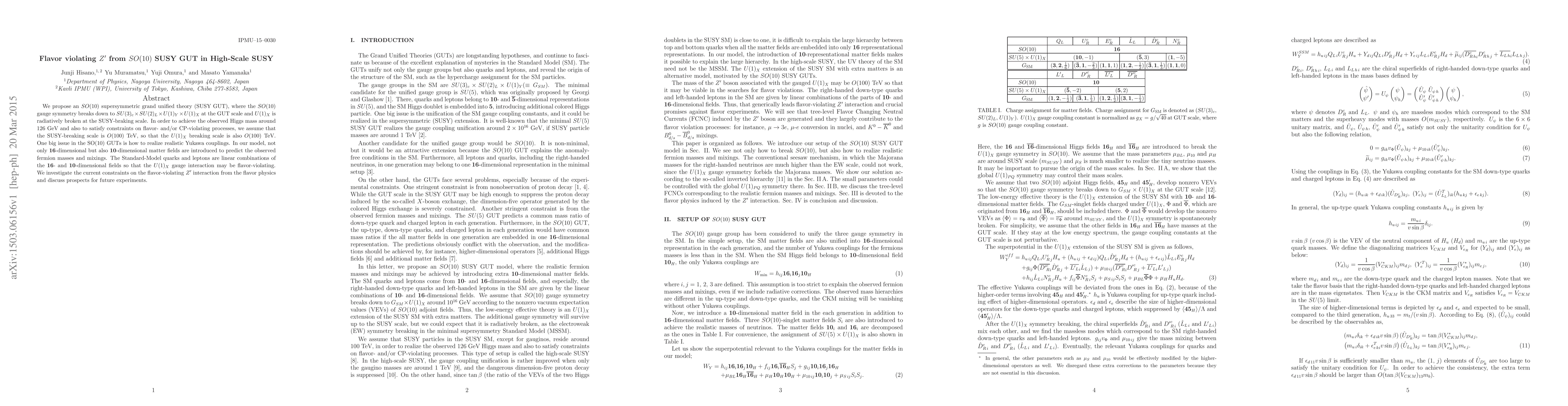 This paper proposes an $SO(10)$ supersymmetric GUT model with high-scale SUSY breaking, where the $U(1)_X$ gauge symmetry breaks at $O(100)$ TeV to accommodate the observed Higgs mass and flavor constraints. The model introduces both ${\bf 16}$- and ${\bf 10}$-dimensional matter fields to achieve realistic Yukawa couplings, leading to potential flavor-violating interactions from the $Z'$ boson, which are investigated against current experimental constraints.