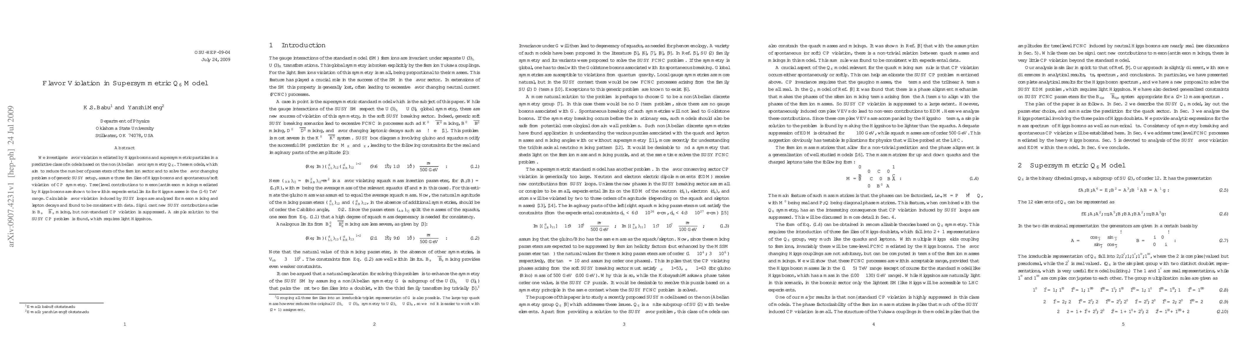 This paper examines flavor violation in supersymmetric models based on the Q_6 non-Abelian flavor symmetry, finding that contributions from Higgs bosons and supersymmetric loops are within experimental limits. Notably, new SUSY contributions to B_s- \bar{B}_s mixing are significant, but CP violation is suppressed, suggesting a solution involving light Higgsinos.