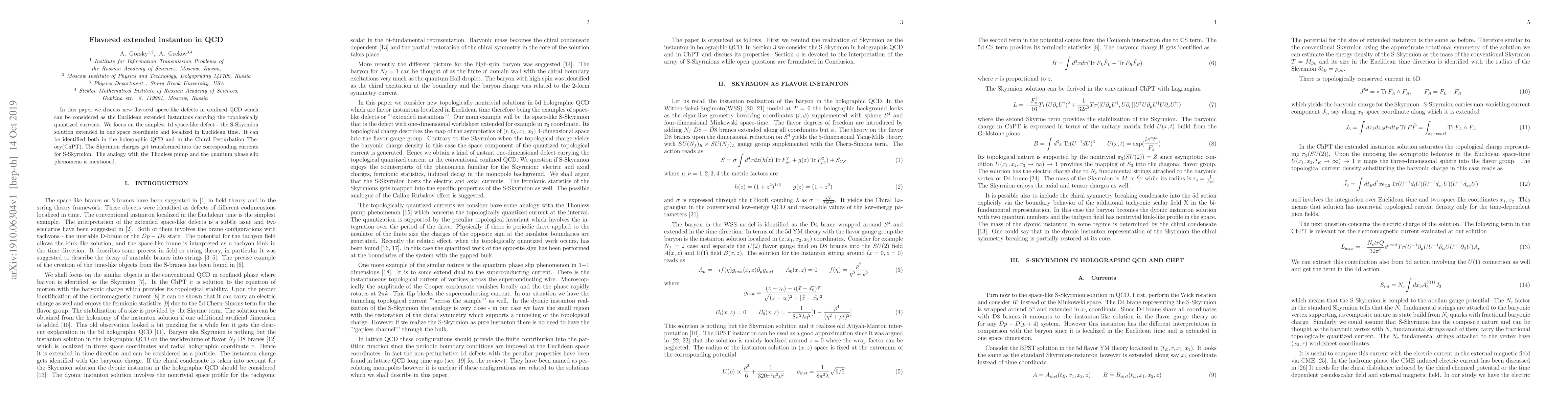 In this paper we discuss new flavored space-like defects in confined QCD which can be considered as the Euclidean extended instantons carrying the topologically quantized currents. We focus on the simplest 1d space-like defect - the S-Skyrmion solution extended in one space coordinate and localized in Euclidean time. It can be identified both in the holographic QCD and in the Chiral Perturbation Theory(ChPT). The Skyrmion charges get transformed into the corresponding currents for S-Skyrmion. The analogy with the Thouless pump and the quantum phase slip phenomena is mentioned.
