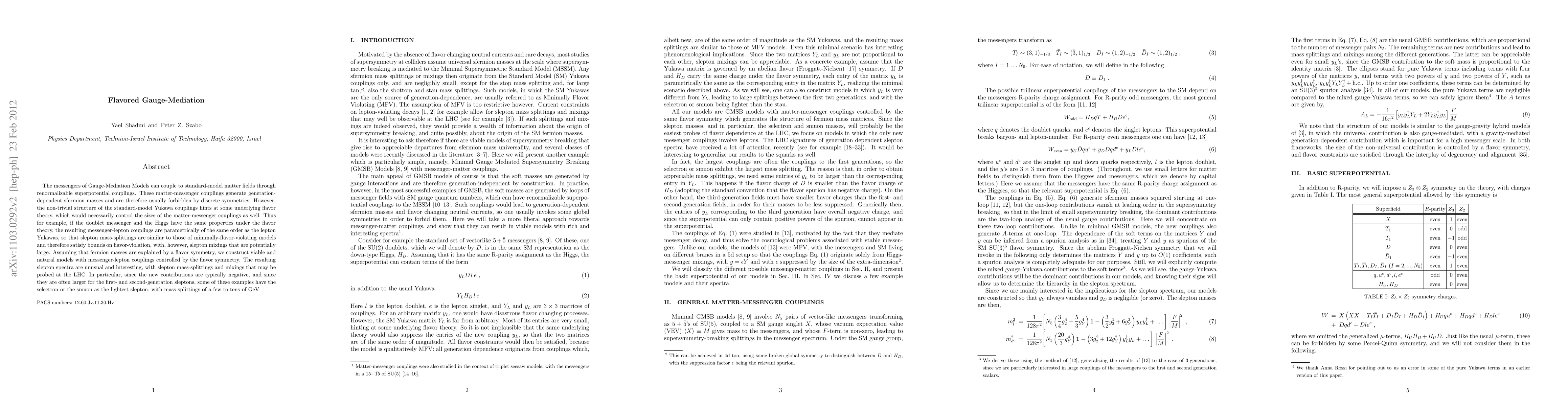 The messengers of Gauge-Mediation Models can couple to standard-model matter fields through renormalizable superpotential couplings. These matter-messenger couplings generate generation-dependent sfermion masses and are therefore usually forbidden by discrete symmetries. However, the non-trivial structure of the standard-model Yukawa couplings hints at some underlying flavor theory, which would necessarily control the sizes of the matter-messenger couplings as well. Thus for example, if the doublet messenger and the Higgs have the same properties under the flavor theory, the resulting messenger-lepton couplings are parametrically of the same order as the lepton Yukawas, so that slepton mass-splittings are similar to those of minimally-flavor-violating models and therefore satisfy bounds on flavor-violation, with, however, slepton mixings that are potentially large. Assuming that fermion masses are explained by a flavor symmetry, we construct viable and natural models with messenger-lepton couplings controlled by the flavor symmetry. The resulting slepton spectra are unusual and interesting, with slepton mass-splittings and mixings that may be probed at the LHC. In particular, since the new contributions are typically negative, and since they are often larger for the first- and second-generation sleptons, some of these examples have the selectron or the smuon as the lightest slepton, with mass splittings of a few to tens of GeV.