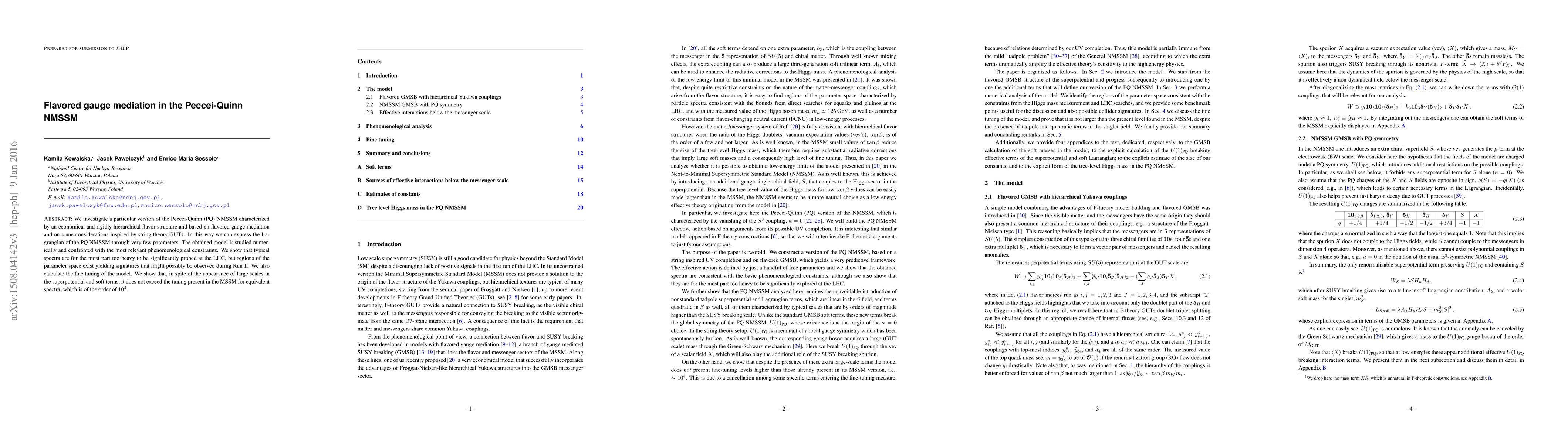 This paper explores a flavored gauge mediation version of the Peccei-Quinn Next Minimal Supersymmetric Standard Model (PQ NMSSM) with a hierarchical flavor structure inspired by string theory. The model, constrained by phenomenological requirements, suggests that most spectra are too heavy for LHC detection, though some regions may yield observable signatures during Run II. The fine-tuning is comparable to the MSSM.