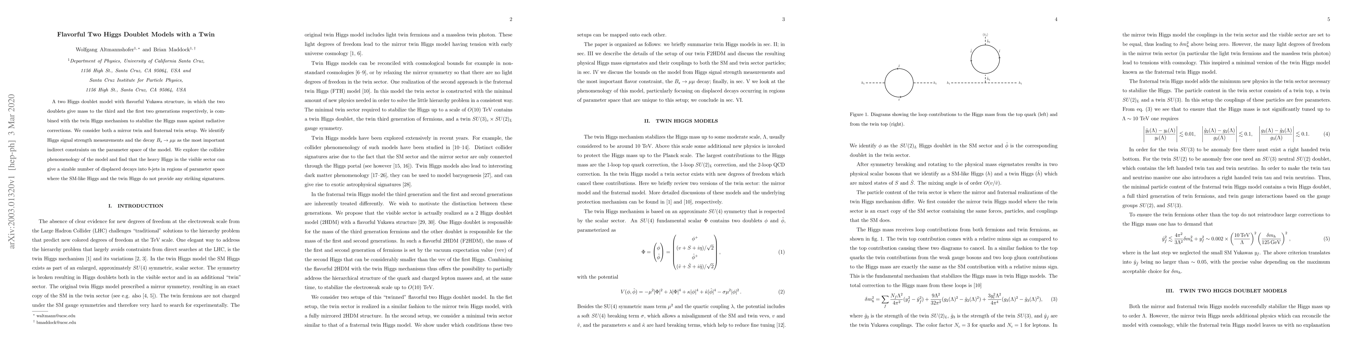 A two Higgs doublet model with flavorful Yukawa structure, in which the two doublets give mass to the third and the first two generations respectively, is combined with the twin Higgs mechanism to stabilize the Higgs mass against radiative corrections. We consider both a mirror twin and fraternal twin setup. We identify Higgs signal strength measurements and the decay $B_s \to \mu\mu$ as the most important indirect constraints on the parameter space of the model. We explore the collider phenomenology of the model and find that the heavy Higgs in the visible sector can give a sizable number of displaced decays into $b$-jets in regions of parameter space where the SM-like Higgs and the twin Higgs do not provide any striking signatures.