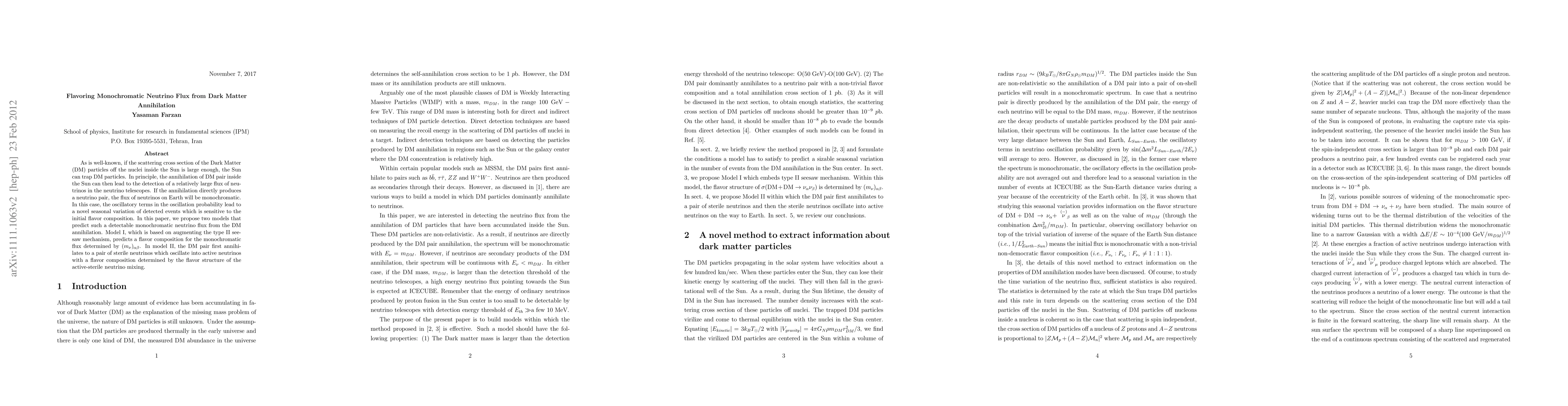 As is well-known, if the scattering cross section of the Dark Matter (DM) particles off the nuclei inside the Sun is large enough, the Sun can trap DM particles. In principle, the annihilation of DM pair inside the Sun can then lead to the detection of a relatively large flux of neutrinos in the neutrino telescopes. If the annihilation directly produces a neutrino pair, the flux of neutrinos on Earth will be monochromatic. In this case, the oscillatory terms in the oscillation probability lead to a novel seasonal variation of detected events which is sensitive to the initial flavor composition. In this paper, we propose two models that predict such a detectable monochromatic neutrino flux from the DM annihilation. Model I, which is based on augmenting the type II seesaw mechanism, predicts a flavor composition for the monochromatic flux determined by $(m_\nu)_{\alpha \beta}$. In model II, the DM pair first annihilates to a pair of sterile neutrinos which oscillate into active neutrinos with a flavor composition determined by the flavor structure of the active-sterile neutrino mixing.