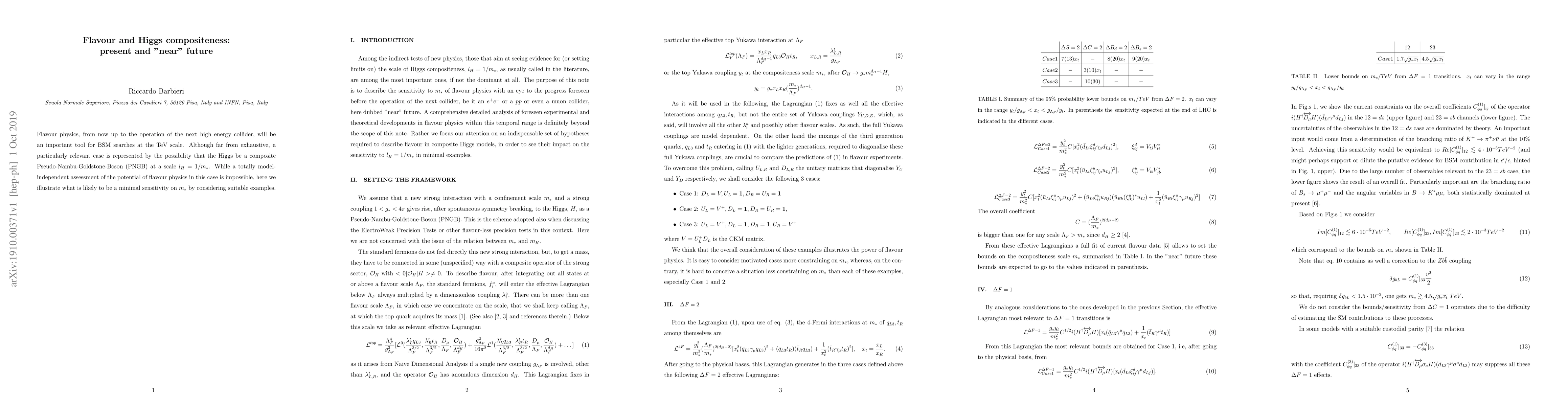 Flavour physics, from now up to the operation of the next high energy collider, will be an important tool for BSM searches at the TeV scale. Although far from exhaustive, a particularly relevant case is represented by the possibility that the Higgs be a composite Pseudo-Nambu-Goldstone-Boson (PNGB) at a scale $l_H=1/m_*$. While a totally model-independent assessment of the potential of flavour physics in this case is impossible, here we illustrate what is likely to be a minimal sensitivity on $m_*$ by considering suitable examples.\