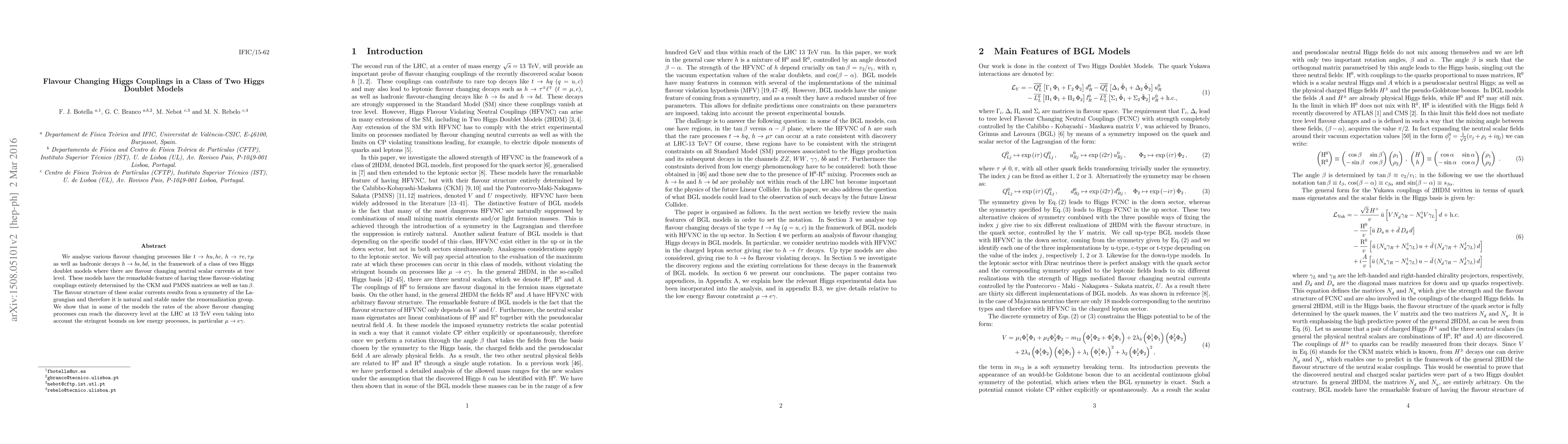 This paper investigates flavour-changing neutral currents in a class of two Higgs doublet models, where these couplings are determined by the CKM and PMNS matrices and $\tan\beta$. The study finds that certain models could exhibit observable rates of flavour-changing processes at the LHC, despite stringent low-energy bounds.