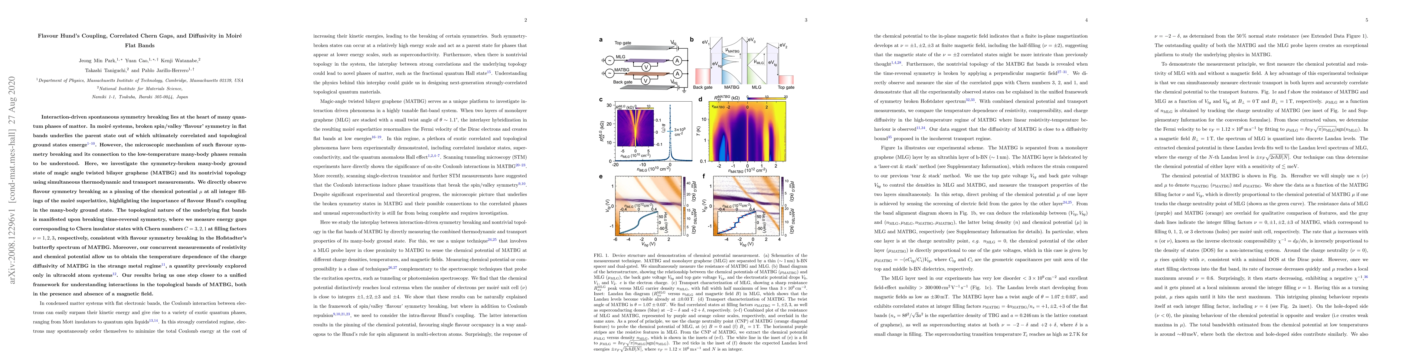 Interaction-driven spontaneous symmetry breaking lies at the heart of many quantum phases of matter. In moir\'e systems, broken spin/valley 'flavour' symmetry in flat bands underlies the parent state out of which ultimately correlated and topological ground states emerge. However, the microscopic mechanism of such flavour symmetry breaking and its connection to the low-temperature many-body phases remain to be understood. Here, we investigate the symmetry-broken many-body ground state of magic angle twisted bilayer graphene (MATBG) and its nontrivial topology using simultaneous thermodynamic and transport measurements. We directly observe flavour symmetry breaking as a pinning of the chemical potential $\mu$ at all integer fillings of the moir\'e superlattice, highlighting the importance of flavour Hund's coupling in the many-body ground state. The topological nature of the underlying flat bands is manifested upon breaking time-reversal symmetry, where we measure energy gaps corresponding to Chern insulator states with Chern numbers $C=3,2,1$ at filling factors $\nu=1,2,3$, respectively, consistent with flavour symmetry breaking in the Hofstadter's butterfly spectrum of MATBG. Moreover, our concurrent measurements of resistivity and chemical potential allow us to obtain the temperature dependence of the charge diffusivity of MATBG in the strange metal regime, a quantity previously explored only in ultracold atom systems. Our results bring us one step closer to a unified framework for understanding interactions in the topological bands of MATBG, both in the presence and absence of a magnetic field.