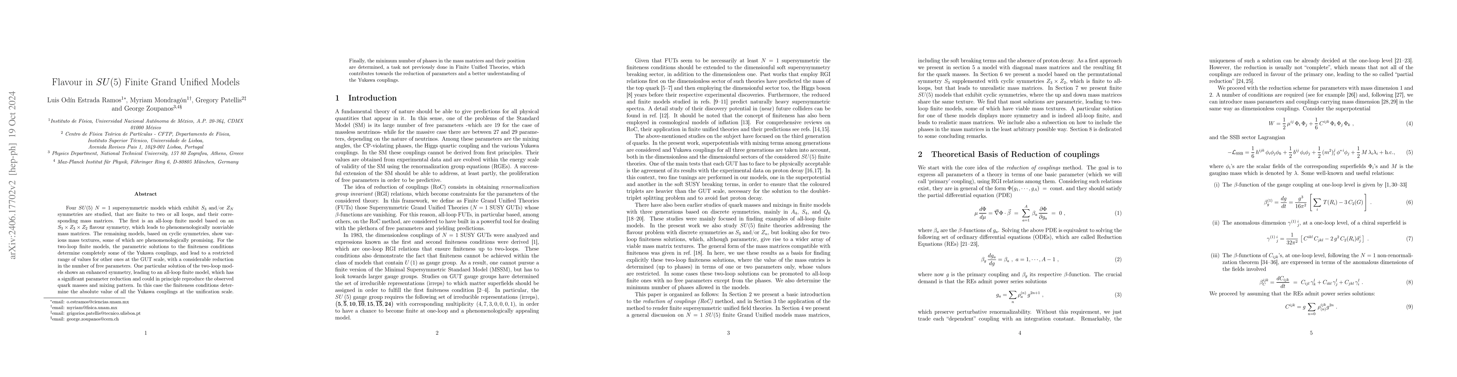 We study four $SU(5) ~ N=1$ supersymmetric models which exhibit $S_3$ and/or $Z_N$ symmetries, that are finite to two or all loops, and their corresponding mass matrices. The first is an all-loop finite model based on an $S_3\times Z_3\times Z_2$ flavour symmetry, which leads to phenomenologically non-viable mass matrices. The remaining models, based on cyclic symmetries, show various mass textures, some of which are phenomenologically promising leading to a Nearest Neighbour Interaction texture. In particular, an all-loop finite model was identified, which has a significant parameter reduction and could reproduce the observed quark masses and mixing pattern. In the latter case the finiteness conditions determine the absolute value of the Yukawa couplings at the unification scale. For the two-loop finite models, the parametric solutions to the finiteness conditions lead to an allowed range of values for the Yukawa couplings at the GUT scale, also with a considerable reduction in the number of free parameters. Finally, we determine the minimum number of phases in the mass matrices and their position, not previously done in Finite Unified Theories, which contributes towards the reduction of parameters and a better understanding of the Yukawa couplings.