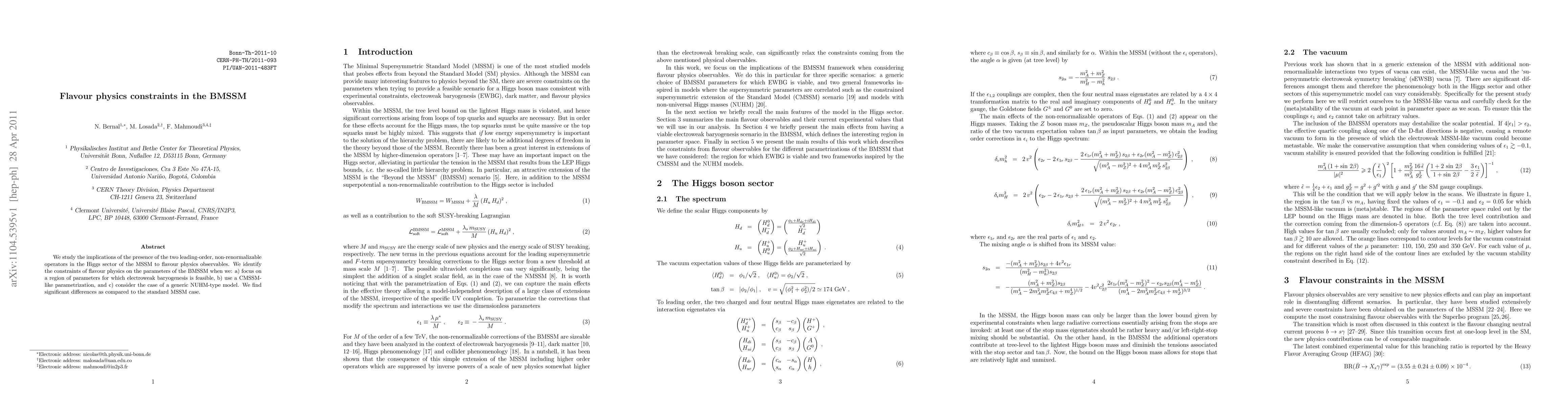 This paper investigates how two leading-order non-renormalizable operators in the Higgs sector of the MSSM affect flavour physics observables within the BMSSM framework. It identifies significant flavour constraints on BMSSM parameters, especially in regions where electroweak baryogenesis is feasible, using CMSSM-like and NUHM-type models.