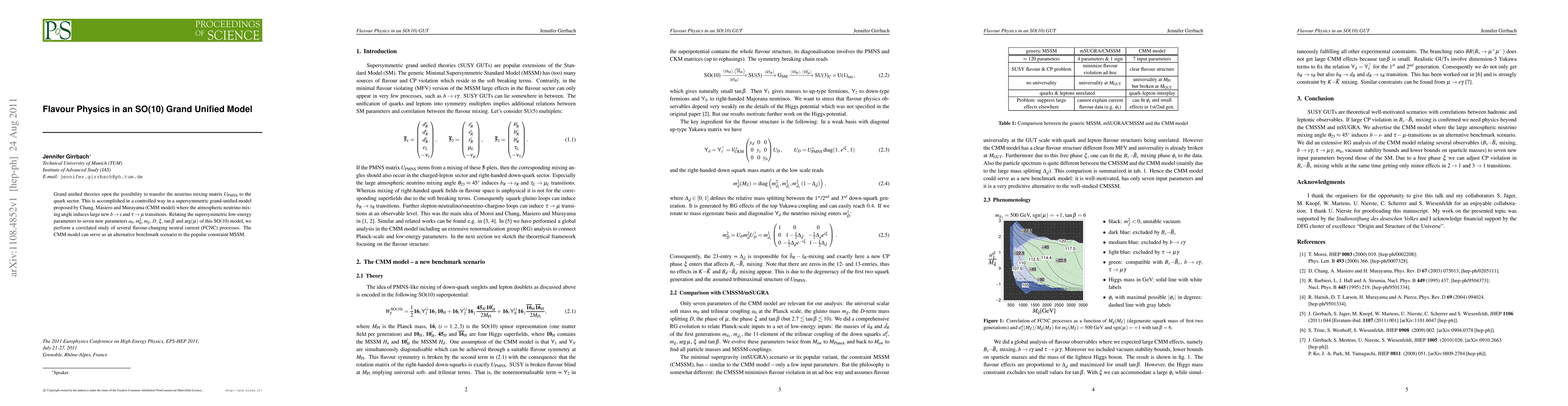 Grand unified theories open the possibility to transfer the neutrino mixing matrix U_PMNS to the quark sector. This is accomplished in a controlled way in a supersymmetric grand-unified model proposed by Chang, Masiero and Murayama (CMM model) where the atmospheric neutrino mixing angle induces large new b -> s and tau -> mu transitions. Relating the supersymmetric low-energy parameters to seven new parameters a_0, m_0^2, m_tilde{g}, D, xi, tan beta and arg(mu) of this SO(10) model, we perform a correlated study of several flavour-changing neutral current (FCNC) processes. The CMM model can serve as an alternative benchmark scenario to the popular constraint MSSM.