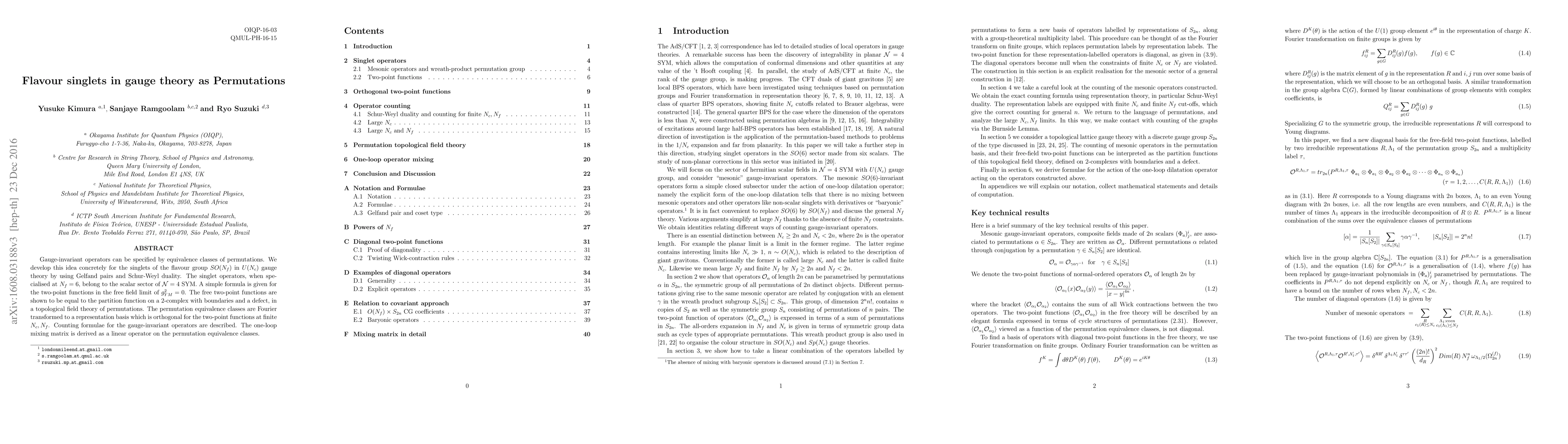 Gauge-invariant operators can be specified by equivalence classes of permutations. We develop this idea concretely for the singlets of the flavour group $SO(N_f)$ in $U(N_c)$ gauge theory by using Gelfand pairs and Schur-Weyl duality. The singlet operators, when specialised at $N_f =6$, belong to the scalar sector of ${\cal N}=4$ SYM. A simple formula is given for the two-point functions in the free field limit of $g_{YM}^2 =0$. The free two-point functions are shown to be equal to the partition function on a 2-complex with boundaries and a defect, in a topological field theory of permutations. The permutation equivalence classes are Fourier transformed to a representation basis which is orthogonal for the two-point functions at finite $N_c , N_f$. Counting formulae for the gauge-invariant operators are described. The one-loop mixing matrix is derived as a linear operator on the permutation equivalence classes.