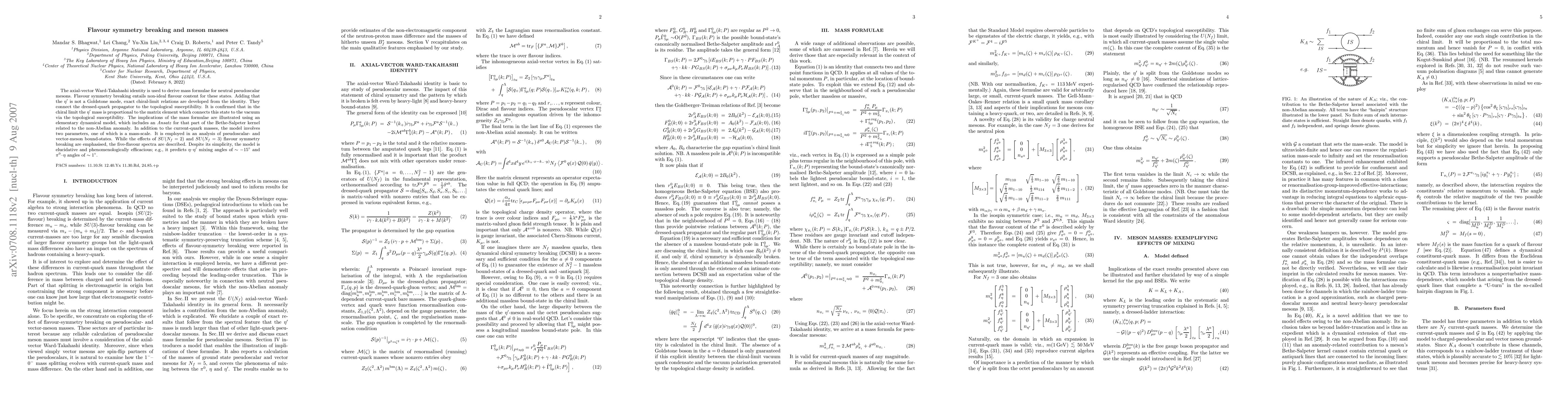The axial-vector Ward-Takahashi identity is used to derive mass formulae for neutral pseudoscalar mesons. Flavour symmetry breaking entails non-ideal flavour content for these states. Adding that the \eta^\prime is not a Goldstone mode, exact chiral-limit relations are developed from the identity. They connect the dressed-quark propagator to the topological susceptibility. It is confirmed that in the chiral limit the \eta^\prime mass is proportional to the matrix element which connects this state to the vacuum via the topological susceptibility. The implications of the mass formulae are illustrated using an elementary dynamical model, which includes an Ansatz for that part of the Bethe-Salpeter kernel related to the non-Abelian anomaly. In addition to the current-quark masses, the model involves two parameters, one of which is a mass-scale. It is employed in an analysis of pseudoscalar- and vector-meson bound-states. While the effects of SU(N_f=2) and SU(N_f=3) flavour symmetry breaking are emphasised, the five-flavour spectra are described. Despite its simplicity, the model is elucidative and phenomenologically efficacious; e.g., it predicts \eta-\eta^\prime mixing angles of ~ (-15 degrees) and \pi^0-\eta angles of ~ 1 degree.