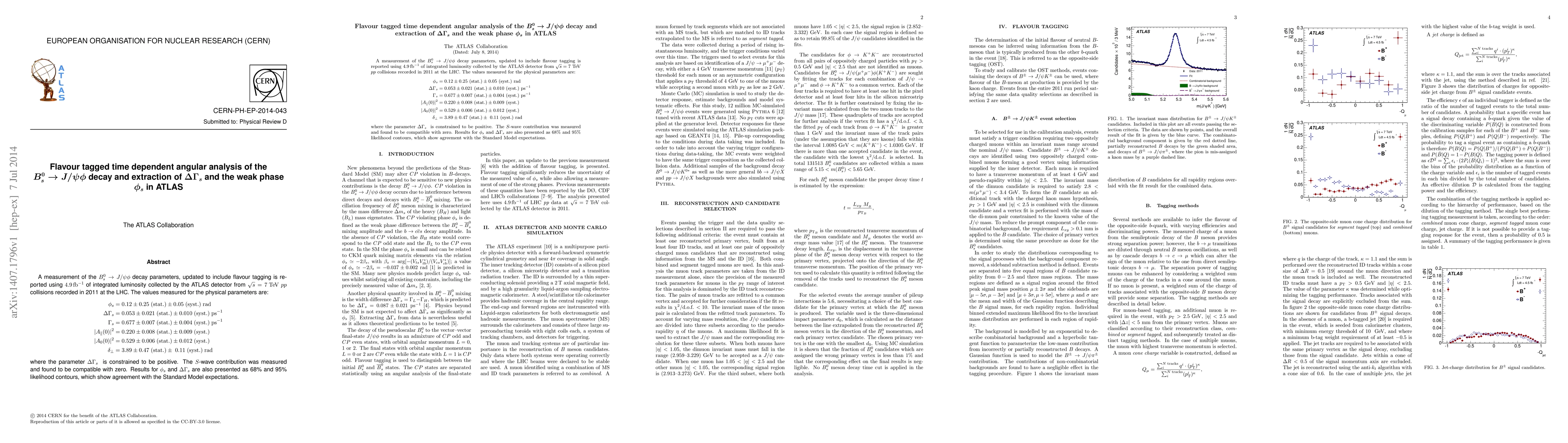 A measurement of the $B_s \rightarrow J/\psi \phi$ decay parameters, updated to include flavour tagging is reported using $4.9 fb^{-1}$ of integrated luminosity collected by the ATLAS detector from $\sqrt{s}= 7$TeV $pp$ collisions recorded in 2011 at the LHC. The values measured for the physical parameters are: \begin{eqnarray*} \phi_s & = & 0.12 \pm 0.25(stat.)\pm 0.05(syst.)rad \\ \Delta\Gamma & = & 0.053 \pm 0.021(stat.) 0.010(syst.)ps^{-1} \\ \Gamma_s & = & 0.677 \pm 0.007 (stat.)\pm 0.004 (syst.)ps^{-1}\\ |A_{\parallel}(0)|^2 & = & 0.220 \pm 0.008 (stat.)\pm 0.009(syst.)\\ |A_{0}(0)|^2 & = & 0.529 \pm 0.006 (stat.)\pm 0.012(syst.)\\ \delta_\perp & = & 3.89 \pm 0.47(stat.) \pm 0.11(syst.)rad \end{eqnarray*} where the parameter $\Delta\Gamma$ is constrained to be positive. The $S$-wave contribution was measured and found to be compatible with zero. Results for $\phi_s$ and $\Delta\Gamma$ are also presented as $68\%$ and $95\%$ likelihood contours, which show agreement with the Standard Model expectations.