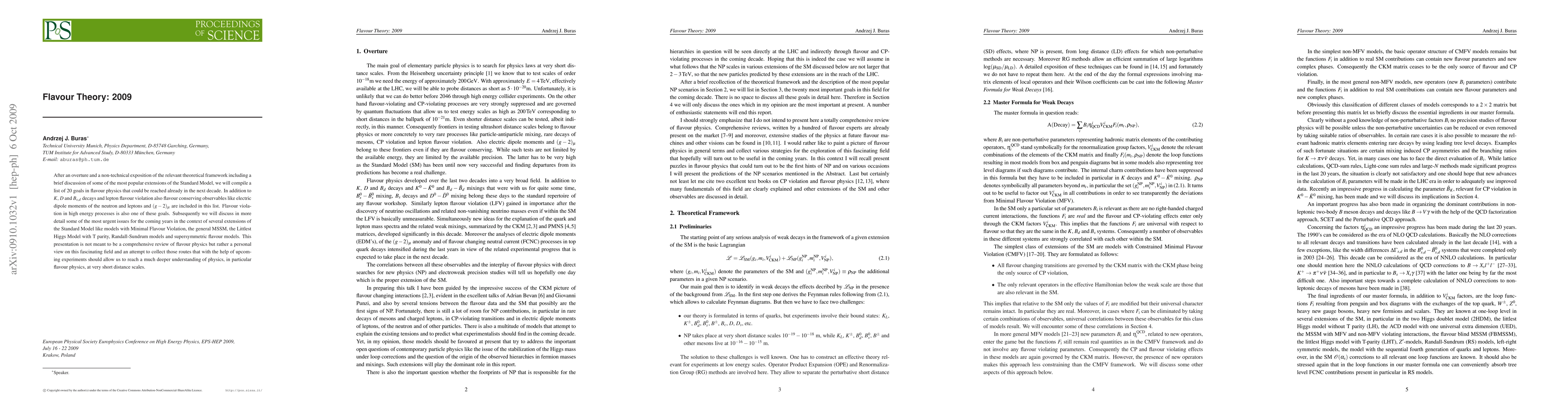 After an overture and a non-technical exposition of the relevant theoretical framework including a brief discussion of some of the most popular extensions of the Standard Model, we will compile a list of 20 goals in flavour physics that could be reached already in the next decade. In addition to K, D and B_{s,d} decays and lepton flavour violation also flavour conserving observables like electric dipole moments of the neutron and leptons and (g-2)_\mu are included in this list. Flavour violation in high energy processes is also one of these goals. Subsequently we will discuss in more detail the most urgent issues for the coming years in the context of several extensions of the Standard Model like models with Minimal Flavour Violation, the general MSSM, the Littlest Higgs Model with T parity, Randall-Sundrum models and supersymmetric flavour models. This presentation is not meant to be a comprehensive review of flavour physics but rather a personal view on this fascinating field and an attempt to collect those routes that with the help of upcoming experiments should allow us to reach a much deeper understanding of physics, in particular flavour physics, at very short distance scales.