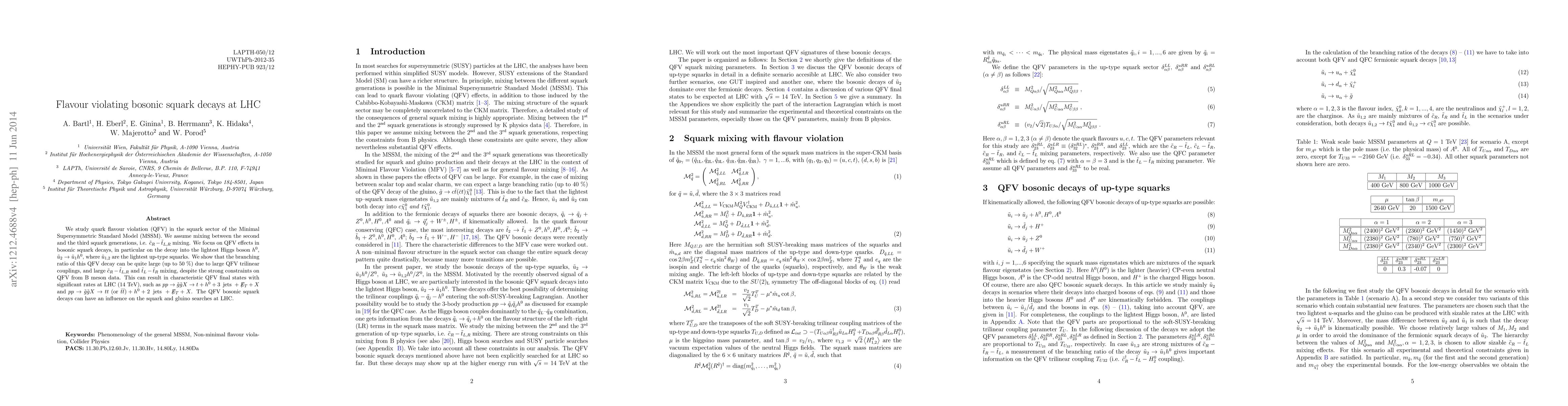 The research investigates quark flavor violation (QFV) in the squark sector of the Minimal Supersymmetric Standard Model (MSSM), focusing on bosonic squark decays into the lightest Higgs boson h0, specifically su_2 -> su_1 h0, with mixing between the second and third squark generations (sc_R-st_{L,R}).
