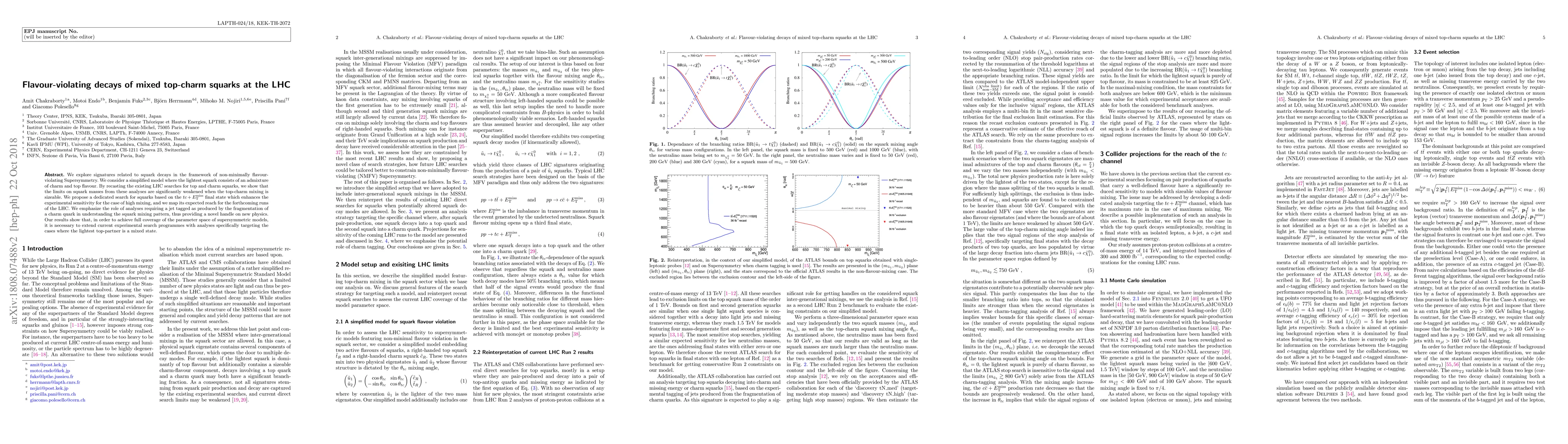 We explore signatures related to squark decays in the framework of non-minimally flavour-violating Supersymmetry. We consider a simplified model where the lightest squark consists of an admixture of charm and top flavour. By recasting the existing LHC searches for top and charm squarks, we show that the limits on squark masses from these analyses are significantly weakened when the top-charm mixing is sizeable. We propose a dedicated search for squarks based on the $tc+{E_{\mathrm{T}}^{\mathrm{miss}}}$ final state which enhances the experimental sensitivity for the case of high mixing, and we map its expected reach for the forthcoming runs of the LHC. We emphasize the role of analyses requiring a jet tagged as produced by the fragmentation of a charm quark in understanding the squark mixing pattern, thus providing a novel handle on new physics. Our results show that, in order to achieve full coverage of the parameter space of supersymmetric models, it is necessary to extend current experimental search programmes with analyses specifically targeting the cases where the lightest top-partner is a mixed state.