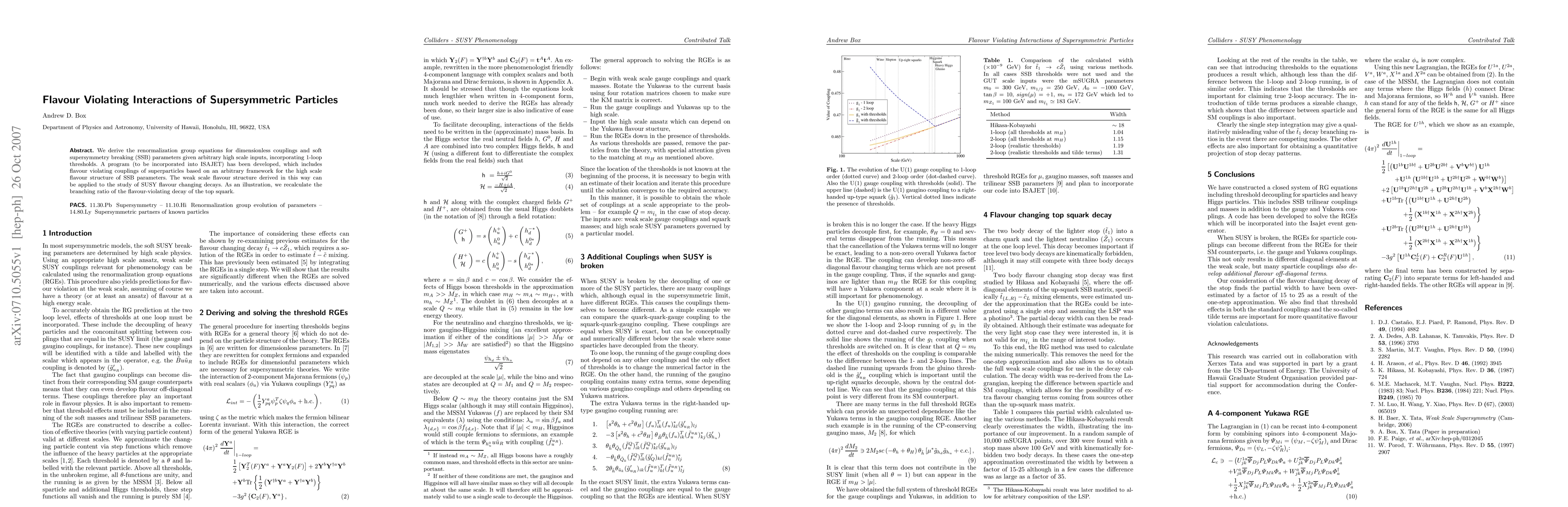 We derive the renormalization group equations for dimensionless couplings and soft supersymmetry breaking (SSB) parameters given arbitrary high scale inputs, incorporating 1-loop thresholds. A program (to be incorporated into ISAJET) has been developed, which includes flavour violating couplings of superparticles based on an arbitrary framework for the high scale flavour structure of SSB parameters. The weak scale flavour structure derived in this way can be applied to the study of SUSY flavour changing decays. As an illustration, we recalculate the branching ratio of the flavour-violating decay of the top squark.
