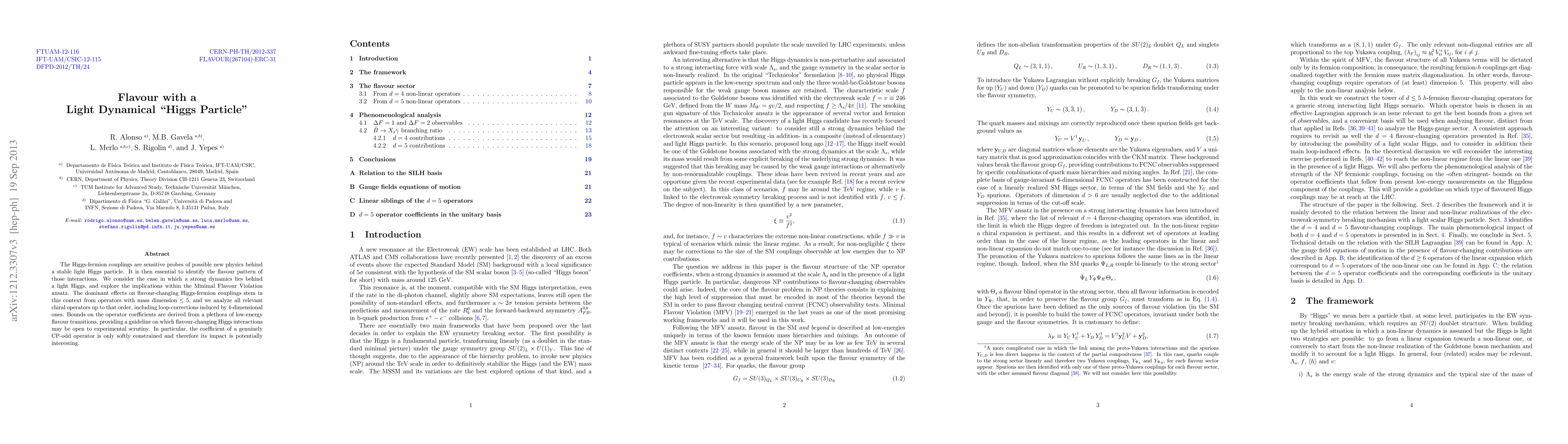 This paper investigates the flavour implications of a light dynamical "Higgs particle" driven by strong dynamics, focusing on Minimal Flavour Violation. It examines the effects of low-dimensional chiral operators on Higgs-fermion couplings and derives bounds on operator coefficients from low-energy flavour transitions, highlighting the potential significance of a CP-odd operator.